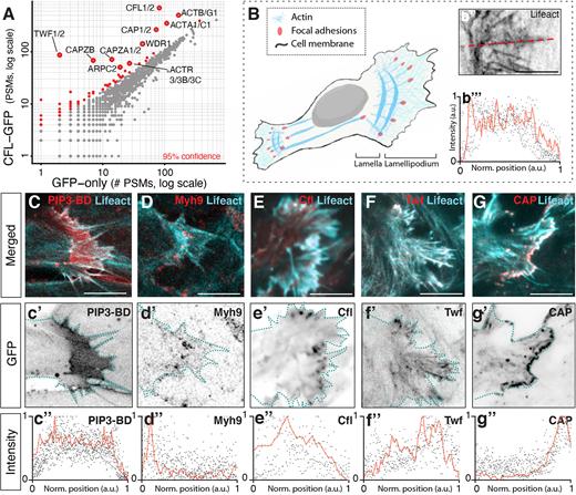 Figure 2. Localization of lamellipodial markers. (A) Interaction partners of Cfl2 were identified based on their enrichment in APMS of the Cfl2–GFP-tagged bait protein (vertical axes) relative to APMS of the untagged GFP controls (horizontal axes). Confidence values were calculated by one-sided Z-test (see Materials and Methods). A pseudocount of 1 PSM was added to each protein for visualization on a log–log plot. (B) Schematic showing the quantification scheme used here. b″, red dotted line indicates line-plot measurement taken along protrusion length; b‴, trace of actin intensity along protrusion length. Red line highlights one example trace, black dots are representative of several line plots. a.u., arbitrary units. (C,c′,c″) Pip3 localization and quantification; LifeAct in the alternate channel reports actin localization. (D,d′,d″) Myh9 localization and quantification. (E,e′,e″) Localization and quantification of Cfl2; LifeAct in the alternate channel reports actin localization. (F,f′,f″) Localization and quantification of Twf1. (G,g′,g″) Localization and quantification of Cap2. Dashed lines highlight cell edges. au, arbitrary units. Images shown are representative of at least three experiments. Scale bars: 10 μm. |