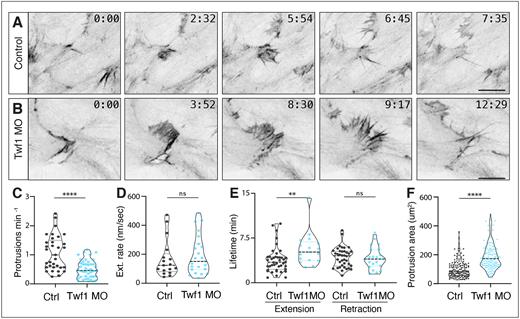Figure 5. Twf1 controls lamellipodial dynamics in the Xenopus DMZ. (A,B) Confocal images of single cells in a LifeAct–GFP-expressing control and Twf1 morphant DMZ. Scale bars: 10 μm. (C) Quantification of lamellipodial protrusion frequency for control and Twf1 morphants. Control versus Twf1 morphant, n=33 control protrusions from two embryos; DMSO, n=44 Twf1 morphant protrusions from four embryos. ****P<0.0001 (Mann–Whitney U-test). (D) Quantification of lamellipodial extension rate. n=17 control protrusions from four embryos; n=23 Twf1 morphant protrusions from five embryos. n.s., not significant for control vs Twf1 morphant (P=0.516; Mann–Whitney U-test). (E) Quantification of lamellipodial extension and retraction lifetimes. n=42 control protrusions from four embryos; n=22 Twf1 morphant protrusions from six embryos. **P<0.01 for control vs Twf1 morphant, extension lifetime; n.s., not significant, for control vs Twf1 morphant retraction lifetime (Mann–Whitney U-test). (F) Quantification of lamellipodial area for control and Twf1 morphants. n=144 control protrusions from three embryos, n=127 Twf1 morphant protrusions from six embryos. ****P<0.0001 for control vs Twf1 morphant (Mann–Whitney U-test). Graphs in C–F are violin plots with the median being highlighted by a dashed line and quartile with dotted lines. |