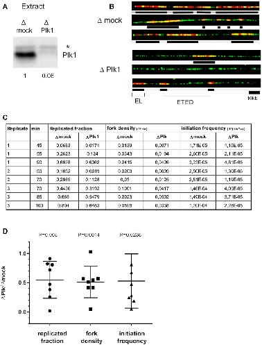 Figure 1. Plk1 depletion decreases replication fork density and initiation frequency during unchallenged S phase. (A) Xenopus egg extracts were mock- or Plk1-depleted and remaining Plk1 was quantified on western blot using anti-Plk1 antibody. * marks a non-specific band. (B) Sperm nuclei (2000 nuclei/μl) were incubated in mock- or Plk1-depleted Xenopus egg extracts in the presence of Biotin-dUTP for different times and analyzed by DNA combing. Selection of three representative DNA fibers of early S phase from mock- (top three) or Plk1-depleted (bottom three) extract; in red, replication eyes labeled by Biotin-dUTP, in green, whole DNA fibers. (C) Replicated fraction (%), fork density (kbâ1) and frequency of initiation (kbâ1sâ1) for three independent experiments at 2 or 3 time points were calculated and reported in the table. (D) scatter blot of ratios Î Plk/Îmock of replication parameters for each line shown in C, with mean (n = 8) and standard deviation, P values, one sample t-test, compared to theoretical mean 1. |