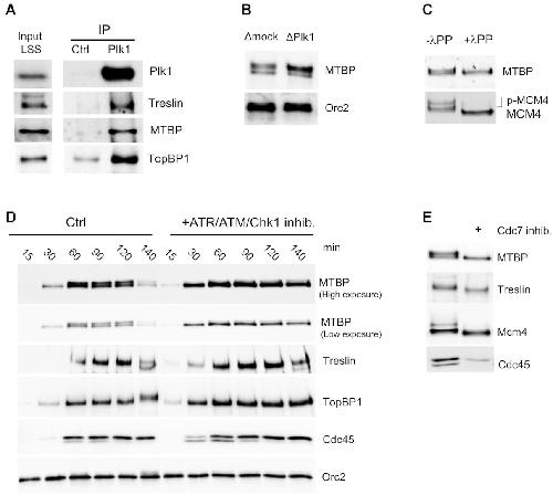 Figure 6. Plk1 co-immunoprecipitates with MTBP, Treslin and TopBP1. (A) Egg extracts were incubated with control (IP Ctrl) or Plk1 (IP Plk1) antibody coupled Sepharose beads. Immunoprecipitates and input extract were subjected to gel electrophoresis and western blot analysis using the indicated antibodies. (B) Chromatin fractions, 60 min after the addition of 2000 nuclei/μl in mock- or Plk1-depleted extracts, analyzed by western blot with indicated antibodies. (C) Chromatin fractions, isolated 60 min after the addition of 2000 nuclei/μl in egg extracts were treated or not with λ phosphatase and subjected to western blotting with indicated antibodies. (D) Sperm nuclei were incubated in egg extracts in the absence or presence of the ATR/ATM inhibitor caffeine (5 mM) and the Chk1 inhibitor AZD7762 (0.5 μM), reactions were stopped at indicated times, chromatin was purified and subjected to western blotting with indicated antibodies. (E) Sperm nuclei were incubated in egg extracts in the absence or presence of the Cdc7 inhibitor PHA767491 (50 μM), reactions were stopped at 60 min, chromatin was purified and subjected to western blotting with indicated antibodies. |