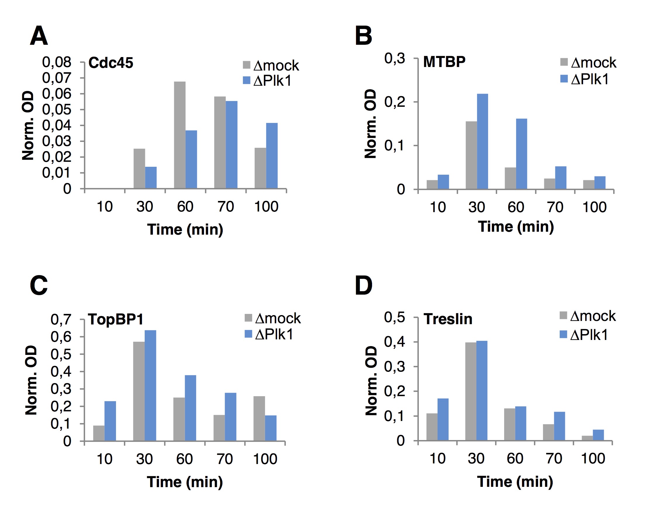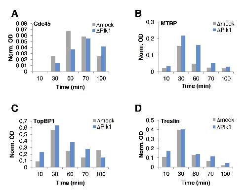Supplementary Figure S6 Plk1 depletion decreases Cdc45 and increases TMT levels on chromatin. Quantification of optical densities (OD) of blots in Fig.5 C, normalized to Orc2 levels. |