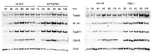 Supplementary Figure S7 Effect of ATR/ATM and Chk1 inhibition separately on chromatin bound MTBP. Same experiment than in Fig. 6D but inhibitors (caffeine (ATR/ATMi) and AZD7762 (Chk1i)) were added in separated replication reactions and chromatin bound proteins were isolated and revealed in western blotting with indicated antibodies |