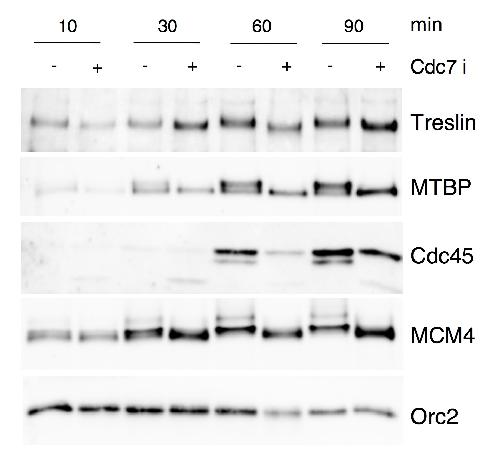 Supplementary Figure S8 DDK inhibition leads to a mobility shift of chromatin bound MTBP and Treslin throughout S phase. Complete time course experiment of Fig.6E, showing additional time points, 10, 30 and 90 min to better appreciate the reproducibility of mobility shifts during S phase. |