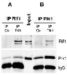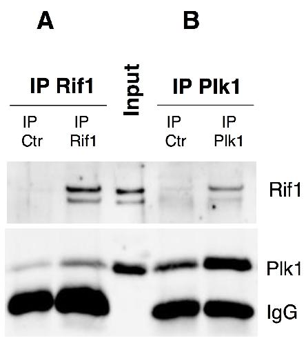 Supplementary Figure S9 Plk1 interacts with Rif1. Nucleoplasmic extract (Input) was incubated with (A) control (IP Ctrl) or Plk1 antibody coupled to Sepharose beads (IP Plk1) or with (B) control (IP Ctrl) or Rif1 antibody coupled to Sepharose beads (IP Rif1). The input and immunoprecipitates were subjected to gel electrophoresis and western blot analysis using the indicated antibodies. |