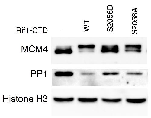 Supplementary Figure S11 Effect of Rif1-CTD WT (wild-type), S2058D and S2058A mutant on chromatin-bound PP1 and MCM4. Experiment as in Fig.9C, but equivalent amounts of WT or mutants were added to replication reactions, chromatin was purified after 60 min and immuno-blotted with indicated antibodies, Histone H3 as loading control. |