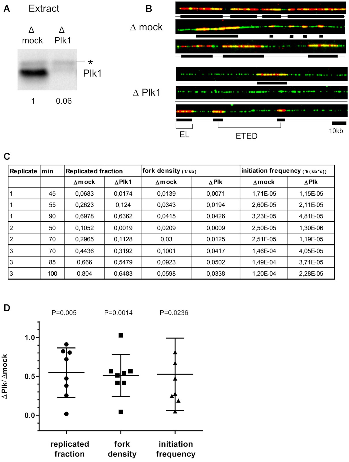 Supplementary Figure S1 Plk1 depletion induces a decrease in replication extent, fork density and initiation frequency in three independent DNA combing replicates. Plots from values presented in Figure 1C, analysis performed as described in Material and Methods Section. |