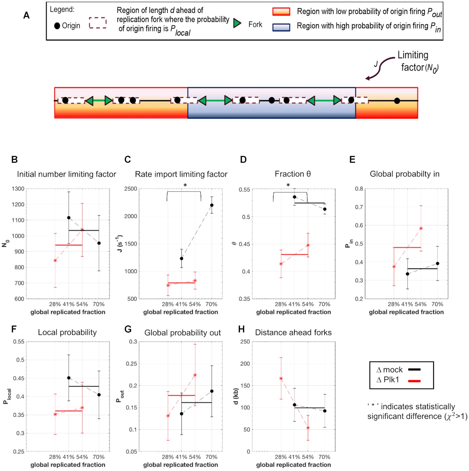 Figure 3. Numerical simulations: Plk1 depletion decreases the fraction of the genome with high probability origin firing, θ, and the rate of import of limiting factors, J. (A) Diagram of numerical model from (29): Potential replication origins located in a fraction θ of the genome have a probability of firing \documentclass[12pt]{minimal} \usepackage{amsmath} \usepackage{wasysym} \usepackage{amsfonts} \usepackage{amssymb} \usepackage{amsbsy} \usepackage{upgreek} \usepackage{mathrsfs} \setlength{\oddsidemargin}{-69pt} \begin{document} }{}${P_{in}}$\end{document} higher than probability of firing \documentclass[12pt]{minimal} \usepackage{amsmath} \usepackage{wasysym} \usepackage{amsfonts} \usepackage{amssymb} \usepackage{amsbsy} \usepackage{upgreek} \usepackage{mathrsfs} \setlength{\oddsidemargin}{-69pt} \begin{document} }{}${P_{out}}$\end{document} of potential origins located in the complementary genome fraction 1 - θ. The firing of a potential origin requires its encounter with limiting factors whose number \documentclass[12pt]{minimal} \usepackage{amsmath} \usepackage{wasysym} \usepackage{amsfonts} \usepackage{amssymb} \usepackage{amsbsy} \usepackage{upgreek} \usepackage{mathrsfs} \setlength{\oddsidemargin}{-69pt} \begin{document} }{}$N\;( t ) = {N_0}\; + Jt$\end{document} increases as S phase progresses. The origin firing probability over a distance d ahead of a replication fork is enhanced of a probability \documentclass[12pt]{minimal} \usepackage{amsmath} \usepackage{wasysym} \usepackage{amsfonts} \usepackage{amssymb} \usepackage{amsbsy} \usepackage{upgreek} \usepackage{mathrsfs} \setlength{\oddsidemargin}{-69pt} \begin{document} }{}${P_{local}}$\end{document}. (B–H) Inferred model parameters by fitting Δmock and ΔPlk1 depleted combing data for two different time points as indicated with replicated fraction: circles indicate the mean value of the parameters over 100 different runs of the genetic algorithm and the error bar are standard deviations, solid lines are the mean (n = 2) values of consecutive parameters whose differences are not statistically different, (*) indicates significant difference between the Δmock and ΔPlk samples, student t-test as described in Appendix 2 of (29), (\documentclass[12pt]{minimal} \usepackage{amsmath} \usepackage{wasysym} \usepackage{amsfonts} \usepackage{amssymb} \usepackage{amsbsy} \usepackage{upgreek} \usepackage{mathrsfs} \setlength{\oddsidemargin}{-69pt} \begin{document} }{}${{\rm X}^2} >1,$\end{document}P values < 10–7). |