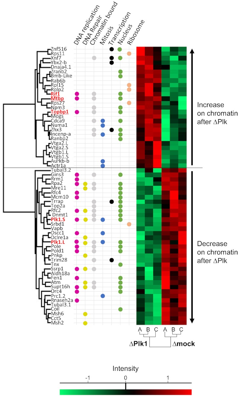 Figure 4. Dynamics of chromatin bound proteins after Plk1 depletion by LC/MS/MS. Sperm nuclei (4000 nuclei/μl) were allowed to replicate in Xenopus egg extracts, chromatin was isolated and analyzed according the Chromass protocol (Materials and Methods). Heat map of significant (P< 0.05) increased or decreased proteins in Plk1 depleted samples versus control samples (A, B, C are triplicates). Protein MS1 intensities are normalized across samples using z score: red indicates intensity above average, bright green below. For each protein, GO-term functions retrieved from Uniprot database manually curated. Plk1.L and Plk1.S signifies proteins encoded by the two different subgenomes L and S of X. laevis. |