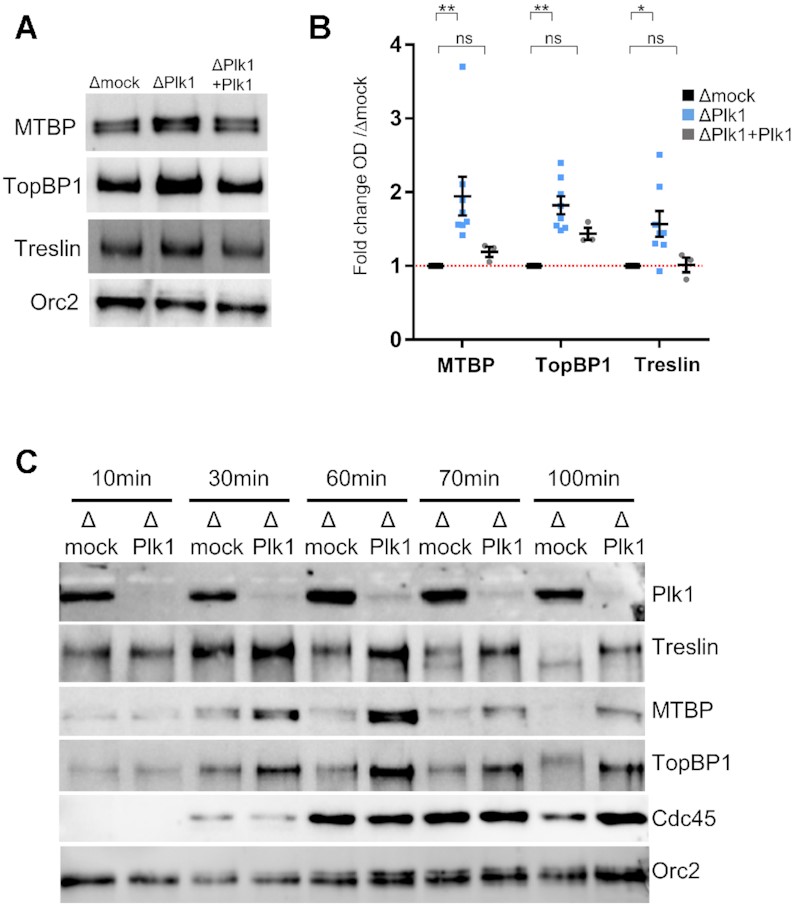 Figure 5. Plk1 depletion stabilizes the binding of Treslin, MTBP and TopBP1 on chromatin. Sperm nuclei (2000 nuclei/μl) were added to mock- and Plk1-depleted egg extracts. Isolated chromatin was subjected to gel electrophoresis and western blot analysis using the indicated antibodies. (A) Representative western blot at 70 min for mock-depleted extracts, Plk1-depleted extracts and Plk1-depleted extracts replenished with recombinant Plk1 (300 nM). (B) Mean fold increase with SEM of MTBP, TopBP1, and Treslin optical density of bands in western blots (OD) normalized to Orc2 in six independent experiments at mid S phase (60â70 min) for depletions (n = 8), three experiments for add back with recombinant Plk1 (n = 3). * indicates significant differences, ns not significant, two-sided, unpaired t-test. (C) As in (A) but chromatin fractions were isolated at indicated times, in parallel with combing experiment from Figure 2. |