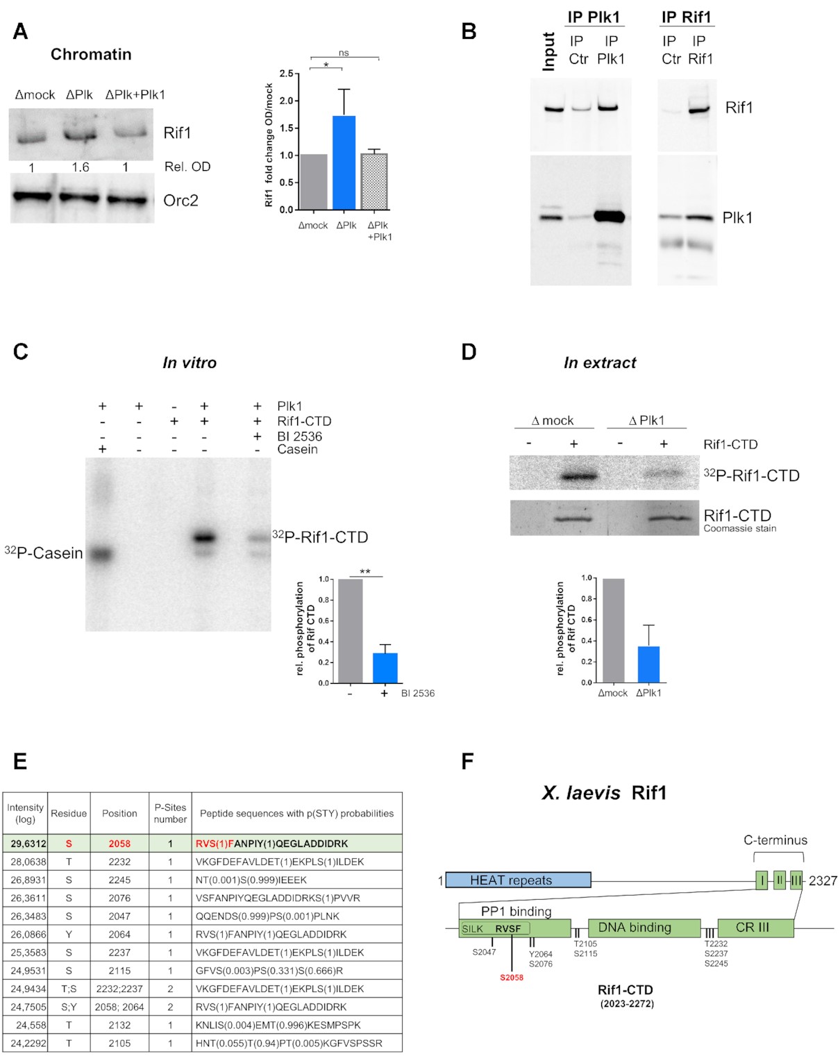 Figure 8. Plk1 interacts with Rif1 and phosphorylates the C-terminal region of Rif1. (A) Left: Chromatin was purified after 70 min incubation of sperm nuclei (2000 nuclei/μl) in extracts depleted of mock, Plk1 or Plk1 replenished with recombinant Plk1 (300 nM) (ÎP + Plk1) and analyzed by western blotting, right: mean (n = 17 and 8) fold change with SEM of Orc2 normalized Rif1 signal compared to mock depletions from four different experiments, Wilcoxon signed rank test, * indicates significant and ns non-significant differences. (B) Cytoplasmic extract, LSS (Input) was incubated with control or Plk1 antibody coupled to Sepharose beads (respectively IP Ctrl and IP Plk1) or with control or Rif1 antibody coupled to Sepharose beads (respectively IP Ctrl and IP Rif1). The input and immunoprecipitates were subjected to gel electrophoresis and western blot analysis using the indicated antibodies. (C) In vitro phosphorylation of recombinant Rif1âCTD (6 μM) or control substrate casein (6 μM) by recombinant Plk1 (60 nM) in the presence of [γ32P]-ATP with or without the Plk1 inhibitor BI2536 (100 nM); left, representative autoradiography of SDS-PAGE; right, mean with SD of relative phosphorylation of three independent experiments, t-test, P value 0.005. (D) Phosphorylation of Rif1âCTD in S phase egg extracts: Rif1âCTD was added to mock- or Plk1- depleted extract in the presence of [γ 32P]-ATP, purified using Ni-Sepharose beads and analyzed on SDS-PAGE. Top, autoradiography; middle, Coomassie stain; bottom, mean (n = 2) with SEM of relative phosphorylation of Rif1âCTD normalized to total Rif1âCTD pulled down (Coomassie). (E) Identified phosphopeptides and modified amino acids in Rif1âCTD phosphorylated in vitro by recombinant Plk1, as in (D), but in the presence of cold ATP, by LC/MS/MS analysis. (F) Diagrammatic representation of Xenopus Rif1 with Rif1âCTD composed of three C-terminal regions (CR) comprising PP1 binding motifs SILK and RVSF located in CRI, adapted from (74). |