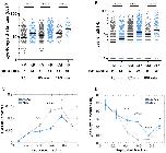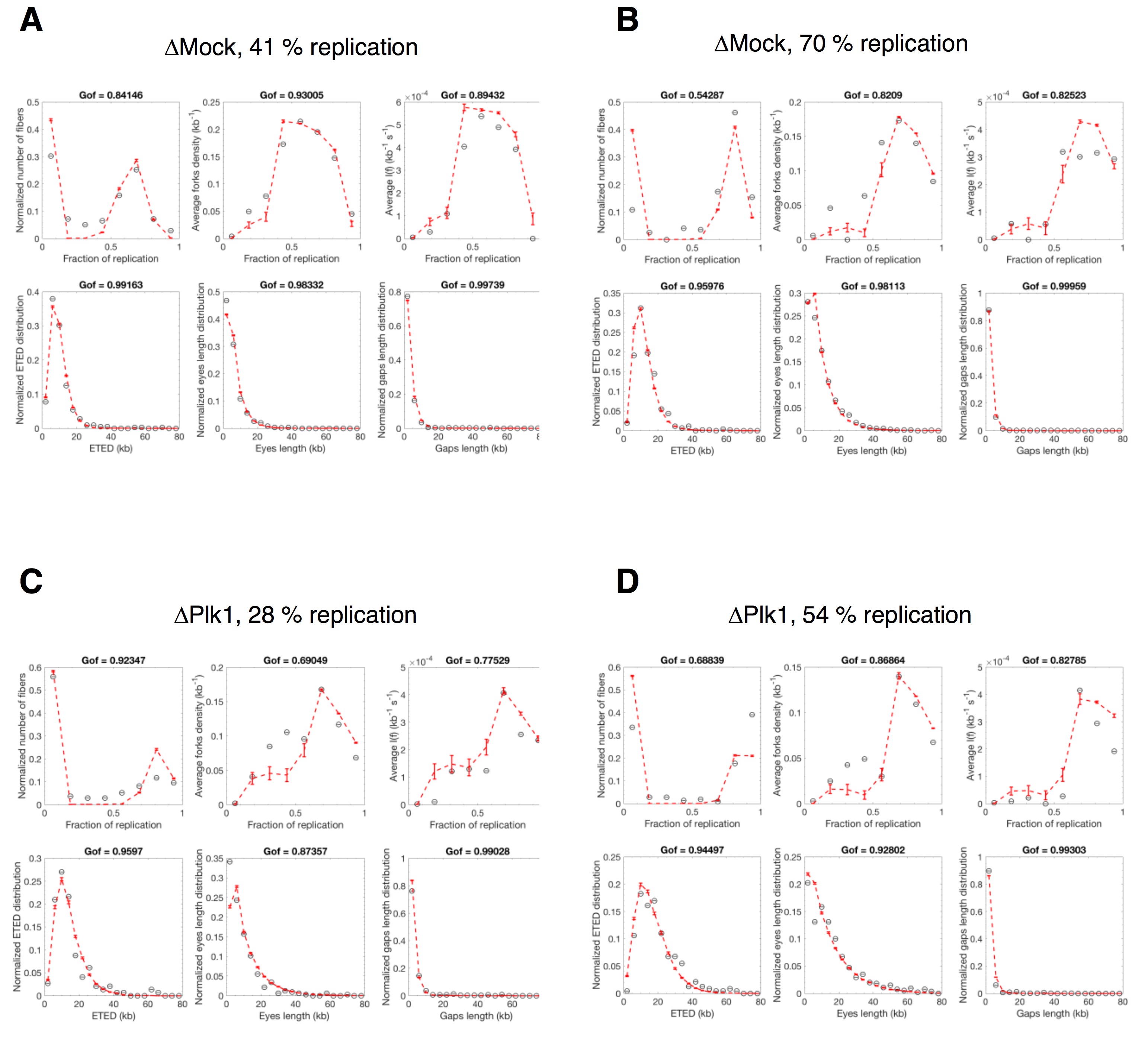 Modeling experimental combing data with MM4 model (Ciardo et al. 2020a) in the case where the potential origins are heterogeneously distributed along the genome. Open circles are experimental data for different replication parameters; the red dashed line is the average of 100 independent fits from MM4 and the red error bars indicate standard deviations. [see suppl. files for equations] |
