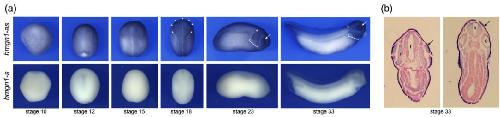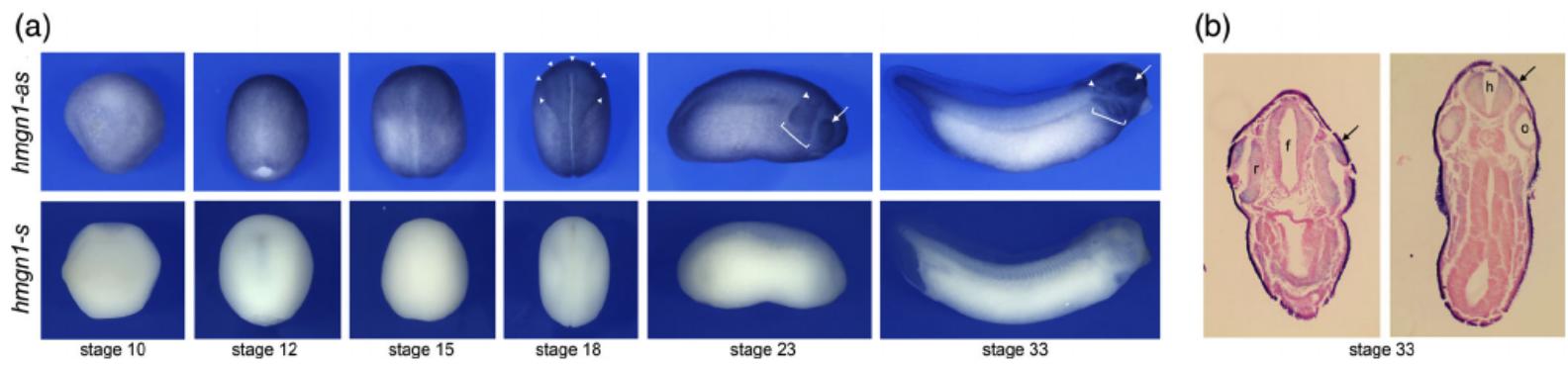 Figure 1 Developmental expression of hmgn1 in Xenopus laevis embryos. (a) At gastrula stages (NF stage 10â12), hmgn1 transcripts(hmgn1-as; upper panels) are detected throughout the embryonic ectoderm. At neurula stages (NF stage 15â18) hmgn1 appears to be enriched atthe neural plate and the neural plate border (stage 18; arrowheads). At stage 23 and 33, hmgn1 is still broadly expressed with stronger expressionin the pharyngeal arches (brackets) and the developing eyes (arrows). Stages 10â18 are dorsal views, anterior to top. Stages 23â33 are lateralviews, dorsal to top, anterior to right. Staining with a control sense probe (hmgn1-s; lower panels) is shown for comparison. (b) Transversesections of a stage 33 embryo at the forebrain (f; left panel) and hindbrain (h; right panel) levels, highlight hmgn1 expression in the skin (arrows),brain, retina of the eye (r) and to a lesser extent in the otic vesicle (o)