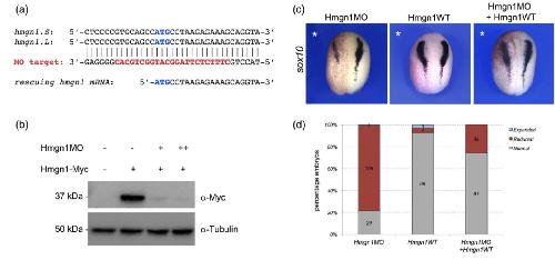 FIGURE 2 Hmgn1 knockdown affects sox10 expression. (a) The sequence targeted by the Hmgn1 translation blocking morpholino antisenseoligonucleotide (Hmgn1MO) is depicted in red. Hmgn1MO targets the ATG start site (blue) of both hmgn1.S and hmgn1.L. The start sequence ofthe rescuing hmgn1 mRNA is shown for comparison, it lacks the 8 bp upstream of the ATG targeted by Hmgn1MO. (b) Western blot analysis fromlysates of embryos injected with hmgn1-Myc mRNA (100 pg) alone, or in combination with increasing doses of Hmgn1MO, 10 ng (+) and 100 ng(++). α-tubulin is shown as a loading control. (c) Unilateral injection of wild-type hmgn1 mRNA (Hmgn1WT; 10 pg) restores sox10 expression inHmgn1-depleted embryos (Hmgn1MO; 20 ng). The injected side is indicated by an asterisk. (d) Quantification of the phenotypes from fourindependent experiments. The number of embryos showing a given phenotype is indicated in each bar