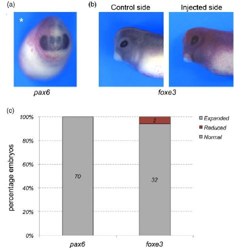 FIGURE 4 Hmgn1 depletion does not affect eye and lens development. (a) Hmgn1 knockdown does not affect the expression of pax6 in the developing eye, prospective lens and forebrain at NF stage 23. Injected side (asterisk) isshowing the lineage tracer Red-Gal.Frontal view, dorsal to top. (b) The expression of foxe3 in the lens vesicle is not affected in Hmgn1 morphant embryos at NF stage 30. Injected side is showingthe lineage tracer Red-Gal. Lateral views,dorsal to top, anterior to left.(c) Quantification of the phenotypes. Thenumber of embryos showing a givenphenotype is indicated in each bar