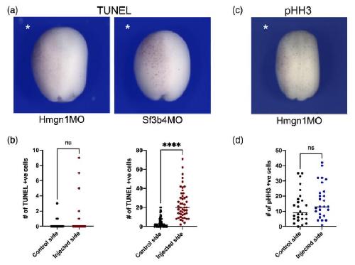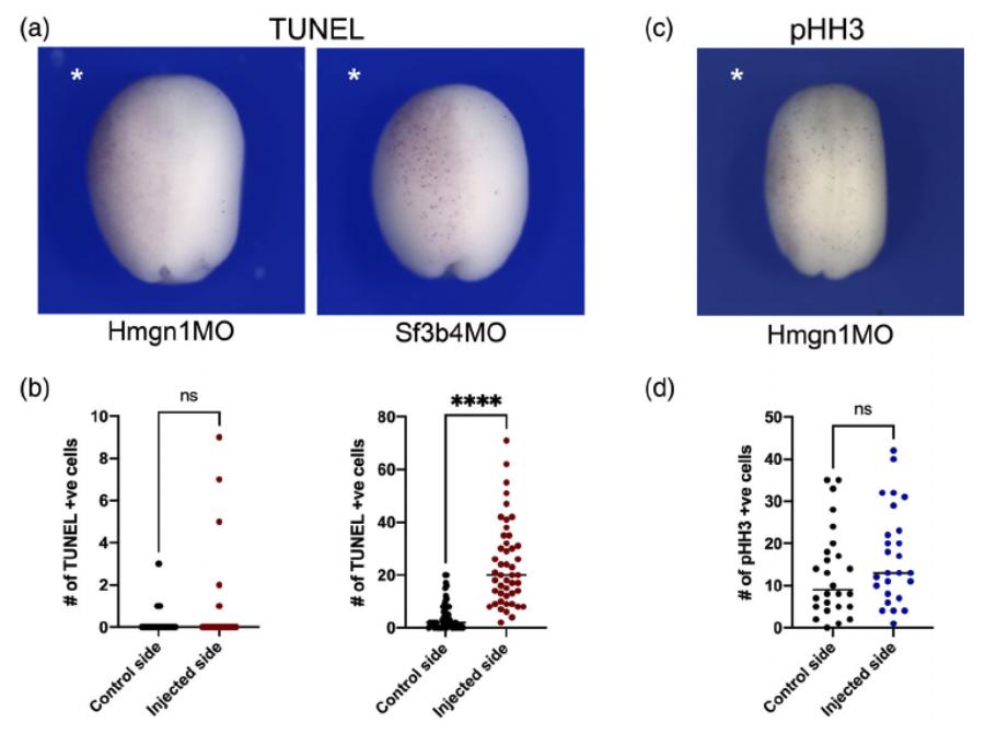 FIGURE 5 Hmgn1 knockdown does not affect cell death or proliferation in the ectoderm. (a) TUNEL staining of representative Hmgn1 and Sf3b4 morphant embryos at stage 15. The injected side is indicated by an asterisk. Dorsal view, anterior to top. (b) Quantification of the number of TUNEL-positive cells in control and injected sides of Hmgn1MO (n = 40; left graph) and Sf3b4MO (n = 47; right graph) injected embryos at stage15. (c) pHH3 immunostaining of a representative Hmgn1 morphant embryos at stage 15. (d) Quantification of the number of pHH3-positive cells in control and injected sides of Hmgn1MO-injected embryos (n = 26). (b, d) Each dot represents one embryo. p-values were calculated using unpaired t-test with Welch's correction, **** p < .0001; ns: not significant