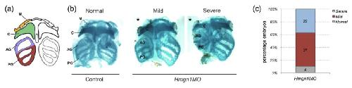 FIGURE 3 Hmgn1 knockdown affects neural crest formation. (a) Phenotype of Hmgn1 MO-injected embryos (20 ng) on neural crest (upper row) and placode (lower row) gene expression at stage 15. The injected side is indicated by an asterisk. Dorsal views, anterior totop, except for dmrta1 and foxi4.1for which anterior views are shown. (b) Quantification of thephenotypes. The number ofembryos showing a givenphenotype is indicated ineach bar