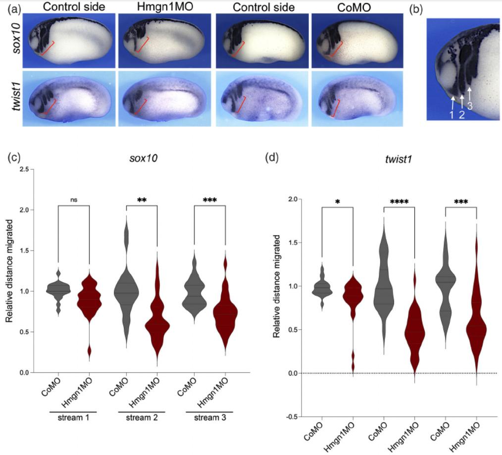 FIGURE 6 Hmgn1 knockdown affects neural crest streams formation. (a) Phenotype of CoMO (20 ng) and Hmgn1MO (20 ng) injected embryos at NF stage 23â25 analyzed for sox10 and twist1 expression. The red brackets indicate the extent of dorso-ventral extension of neural crest streams in control and MO-injected sides. (b) Higher magnification of an embryo stained with sox10 showing the position of the three neural crest streams. Lateral view, dorsal to top, anterior to left. (c,d) Graph plotting the distance migrated by neural crest cells in stream 1, 2, and3 of CoMO- and Hmgn1MO-injected embryos stained by sox10 (c) or twist1 (d). A similar number of embryos were analyzed for each gene(CoMO, n = 21 and Hmgn1MO, n = 30). BrownâForsyth and welch analysis of variance test, with multiple comparisons test (Dunnett) with individual variances computed for each comparison. *, p = .0141; **, p = .0013; ***, p = .0003; **** p < .0001; ns: not significant