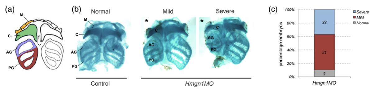 The neural crest is a dynamic embryonic structure that plays a major role in the formation of the vertebrate craniofacial skeleton. Neural crest formation is regulated by a complex sequence of events directed by a network of transcription factors working in concert with chromatin modifiers. The high mobility group nucleosome binding protein 1 (Hmgn1) is a nonhistone chromatin architectural protein, associated with transcriptionally active chromatin. Here we report the expression and function of Hmgn1 during Xenopus neural crest and craniofacial development. Hmgn1 is broadly expressed at the gastrula and neurula stages, and is enriched in the head region at the tailbud stage, especially in the eyes and the pharyngeal arches. Hmgn1 knockdown affected the expression of several neural crest specifiers, including sox8, sox10, foxd3, and twist1, while other genes (sox9 and snai2) were only marginally affected. The specificity of this phenotype was confirmed by rescue, where injection of Hmgn1 mRNA was able to restore sox10 expression in morphant embryos. The reduction in neural crest gene expression at the neurula stage in Hmgn1 morphant embryos correlated with a decreased number of sox10- and twist1-positive cells in the pharyngeal arches at the tailbud stage, and hypoplastic craniofacial cartilages at the tadpole stage. These results point to a novel role for Hmgn1 in the control of gene expression essential for neural crest and craniofacial development. Future work will investigate the precise mode of action of Hmgn1 in this context.