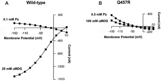 Figure 7. Steady-state currents induced by αMDG and phlorizin in WT and Q457R mutant proteins. Seven days after injection with cRNA, oocytes expressing WT and mutant SGLT1 were perfused with 100 mM NaCl buffer and currents were measured using a 2-electrode voltage clamp. The difference in steady-state currents measured in the absence and in the presence of αMDG or phlorizin (Pz) is plotted at each test potential from â150 to +50 mV. A. In WT, 25 mM αMDG induced Na+ inward current (1500 nA at â150 mV) whereas 0.1 mM Pz blocked the Na+ leak current (+143 nA at â150 mV). B. In Q457R mutant, both 100 mM αMDG and 0.5 mM Pz inhibited the Na+ leak current (+180 and + 360 nA at â150 mV, respectively). Similar results were obtained on oocytes from 3 different frog donors. The oocyte expressing Q457R-cRNA is the same one as shown in the oocyte in Figure 8B (Q/V with and without sugar) and Figure 5 (freeze-fracture)