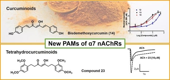 The α7 nicotinic acetylcholine receptor (α7 nAChR) is a ligand-gated ion channel that is involved in cognition disorders, schizophrenia, pain, and inflammation. Allosteric modulation of this receptor might be advantageous to reduce the toxicity in comparison with full agonists. Our previous results obtained with some hydroxy-chalcones, which were identified as positive allosteric modulators (PAMs) of α7 nAChR, prompted us to evaluate the potential of some structurally related naturally occurring flavonoids and curcuminoids and some synthetic curcumin analogues, with the aim of identifying new allosteric modulators of the α7 nAChR. Biological evaluation showed that phloretin, demethoxycurcumin, and bis-demethoxicurcuming behave as PAMs of α7 nAChR. In addition, some new curcumin derivatives were able to enhance the signal evoked by ACh; the activity values found for the tetrahydrocurcuminoid analog 23 were especially promising.