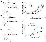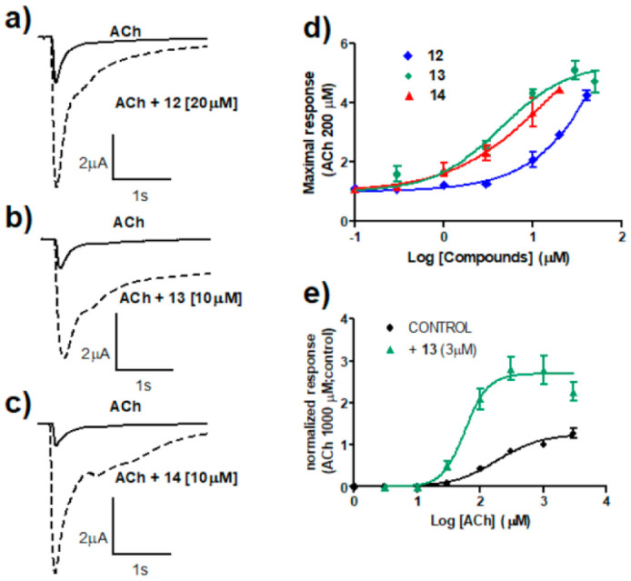 Figure 1. Characterization of curcumin (12) and two curcuminoids (compounds 13 and 14). (a–c) Ionic currents recorded in representative oocytes expressing human α7 nAChRs. Currents were evoked by 600 ms applications of ACh 200 μM in the absence (continuous line) and in the presence (dotted line) of 20 μM of 12 (panel (a)) or 10 μM of 13 (panel (b)) and 14 (panel (c)). All currents were recorded at a holding potential of –80 mV. (d) Concentration–response relationships for the potentiating effect of 12, 13, and 14 co-applied with ACh 200 μM. Continuous lines represent the fit to the Hill equation. Limited solubility of these compounds, especially 12 and 14, hindered the use of higher concentrations in order to adequately complete the curves, so that the following values should be considered with caution. Thus, maximal potentiating effects were estimated as 11 ± 3-, 5.5 ± 0.3-, and 5.5 ± 1.0-fold for compounds 12, 13, and 14, respectively. The EC50 values were 85 ± 35, 4.9 ± 1.0, and 6.9 ± 3.1 μM for 12, 13, and 14, respectively. (e) Concentration–response curves of peak currents elicited by ACh in control conditions or in the presence of 3 μM 13. Data have been normalized to the peak current obtained in control conditions with 1 mM ACh. Lines are fit to the Hill equation with parameters (Imax, EC50, nH): control (1.25, 176 μM, 1.25), 13 (2.70, 57 μM, 2.36). Data were taken from 3–7 oocytes from at least 2 donors.