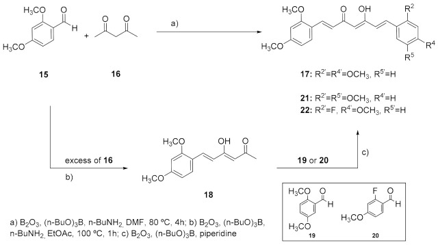 Scheme 1. Synthesis of symmetrically substituted (17) and asymmetrically substituted (21, 22) curcumin derivatives.