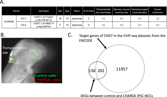 Fig. 3. Defective migration of CHARGE iPSC-NCCs. A. Features of the enrolled CHARGE patients. Both patients had typical CHARGE syndrome phenotypes. B. Representative image of control (green) and CHARGE (red) iPSC-NCCs in chick embryos at 36 h after transplantation into the dorsal side of the developing neural tube at the hindbrain level in a chick embryo at HH-stage 10. C. Venn diagram of 338 differentially expressed genes between control- and CHARGE-iPSC-NCCs and 12,159 listed genes as targets of CHD7 in the ChIP-seq datasets from the ENCODE transcription factor target database.