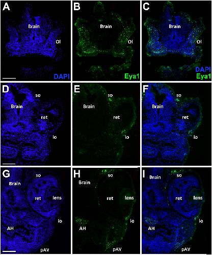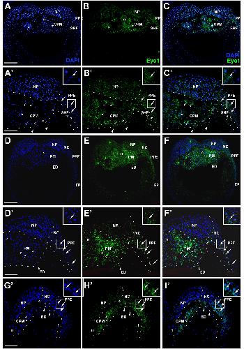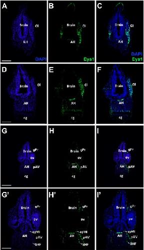Fig. Suppl. 3. Eya1 distribution in transverse sections of Xenopus laevis at stage 32. A-C, G-I: Overview of stage 32 embryo showing nuclear DAPI staining (first column), Eya1 immunostaining (second column) and merged channels (third column) with higher magnification views shown in Aâ-Câ and Gâ-Iâ. Eya1 is expressed in olfactory placode (pOl), adenohypophysis (AH), profundal ganglion (gPr), anteroventral lateral line placode (pAV) and the mesoderm of the secondary heart field (SHF). Eya1 expression is undetectable in brain, optic vesicle (ov) and cement gland (cg). Scale bars: A, D, Gâ: 100 μm (for A-F); G: 200 μm (for G-I). |