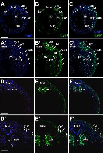 Fig. Suppl. 5. Eya1 distribution in transverse sections of Xenopus laevis at stage 32 (cont.). A-C, D-F Overview of stage 32 embryo showing nuclear DAPI staining (first column), Eya1 immunostaining (second column) and merged channels (third column) with higher magnification views shown in Aâ-Câ and Gâ-Iâ. Eya1 is expressed in anterodorsal lateral line placode (pAD), middle lateral line placode (pM), a glossopharyngeal placode (epIX), the otic vesicle (vOt) and some endodermal cells (arrowheads). Eya1 expression is undetectable in brain. Scale bars: A, D: 200 μm (for A-C, D-F); Aâ, Dâ: 100 μm (for Aâ-Câ, Dâ-Fâ). |