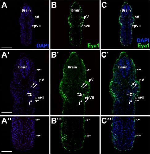 Fig. 7. Eya1 distribution in transverse sections of Xenopus laevis at stage 26 (cont.). A-C: Overview of stage 26 embryo showing nuclear DAPI staining (first column), Eya1 immunostaining (second column) and merged channels (third column) with higher magnification views shown in Aâ-Câ. Eya1 is localized to nuclei in placodes (filled arrows) and endoderm (arrowheads). Eya1 is also expressed in nuclei and apical cytoplasm of scattered cells in the superficial ectodermal layer (open arrows). Eya1 is expressed in trigeminal placode (pV) and facial epibranchial placode (epVII), Eya1 expression is undetectable in brain. Scale bars: A: 200 μm (for A-C); Aâ,ââ: 100 μm (for Aâ-â, Aââ-ââ). |