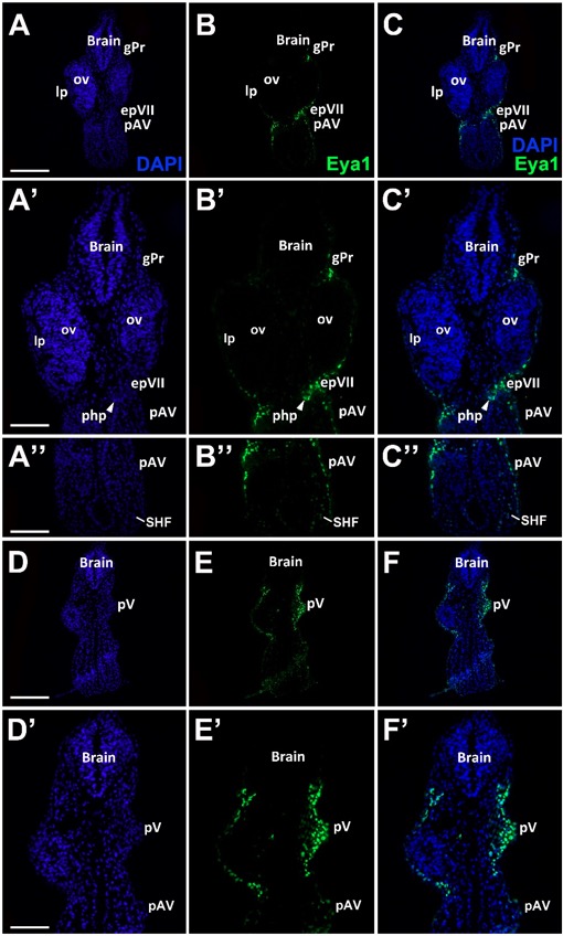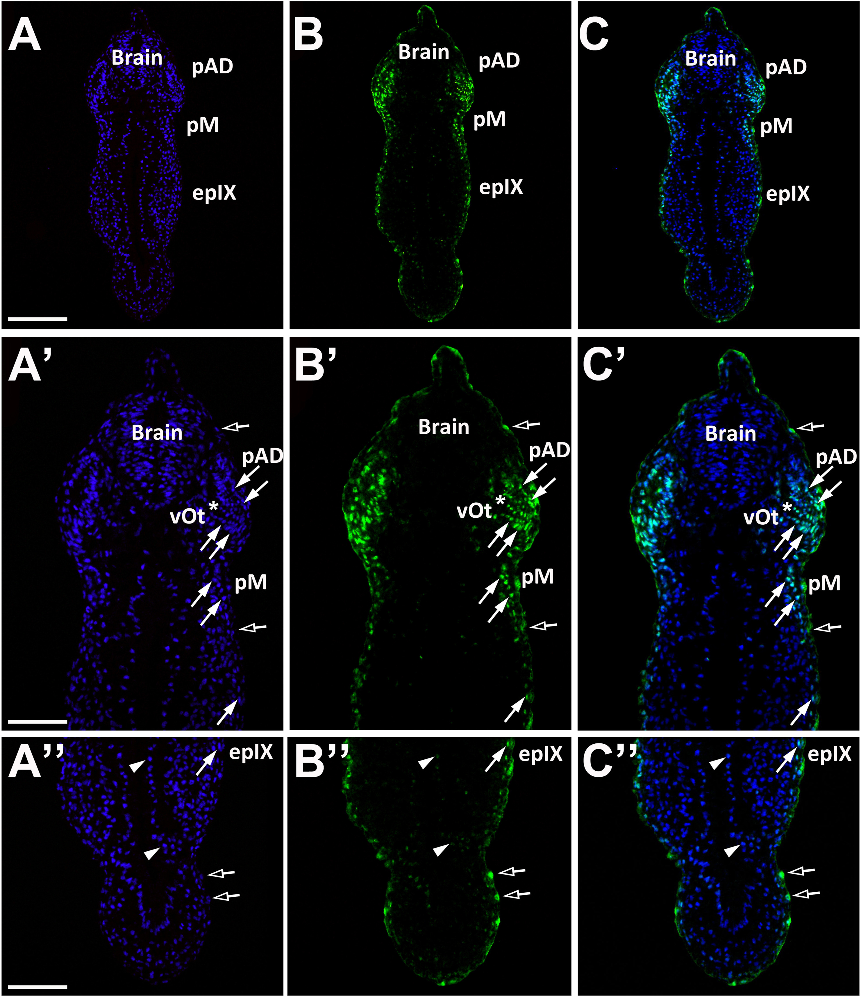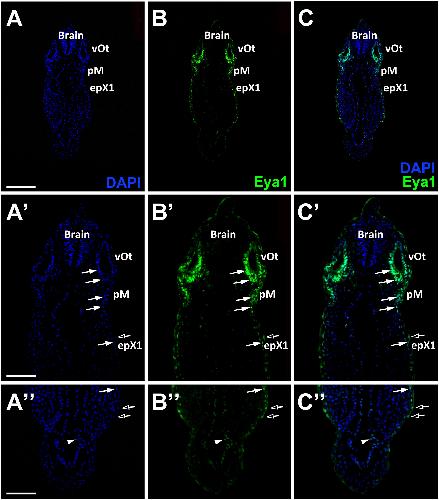 Fig. 8. Eya1 distribution in transverse sections of Xenopus laevis at stage 26 (cont.). A-C: Overview of stage 26 embryo showing nuclear DAPI staining (first column), Eya1 immunostaining (second column) and merged channels (third column) with higher magnification views shown in Aâ-Câ. Eya1 is localized to nuclei in placodes (filled arrows) and endoderm (arrowheads). Eya1 is also expressed in nuclei and apical cytoplasm of scattered cells in the superficial ectodermal layer (open arrows). Eya1 is expressed in anterodorsal lateral line placode (pAD), the invaginating otic vesicle (vOt; asterisk indicates lumen), the middle lateral line placode (pM) and glossopharyngeal epibra |