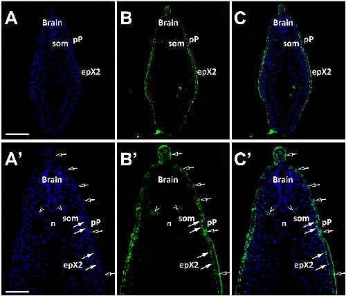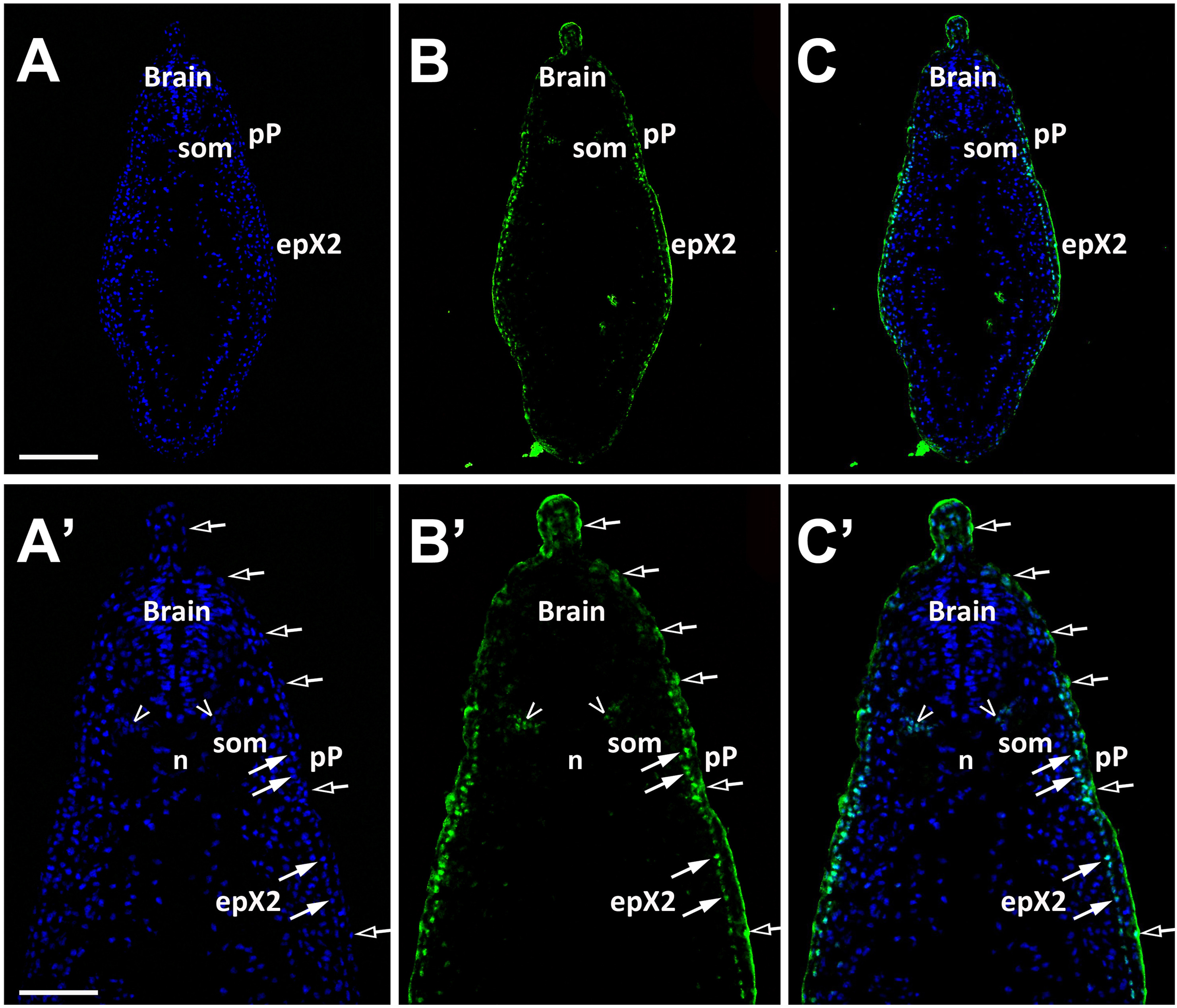 Fig. 10. Eya1 distribution in transverse sections of Xenopus laevis at stage 26 (cont.). A-C: Overview of stage 26 embryo showing nuclear DAPI staining (first column), Eya1 immunostaining (second column) and merged channels (third column) with higher magnification views shown in Aâ-Câ. Eya1 is localized to nuclei in placodes (filled arrows), endoderm (arrowheads) and somites (som; open arrowheads). Eya1 is also expressed in nuclei and apical cytoplasm of scattered cells in the superficial ectodermal layer (open arrows). Eya1 is expressed in the posterior lateral line placode (pP) and the second vagal placode (epX2). Eya1 expression is undetectable in the brain. Scale bars: A: 200 μm (for A-C); Aâ: 100 μm (for Aâ-â). |