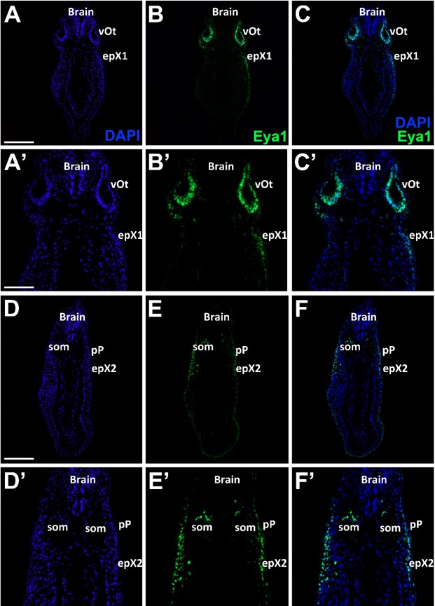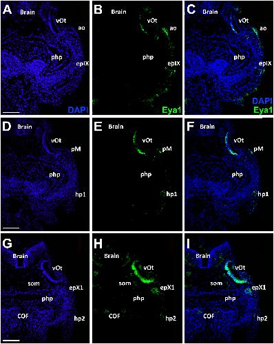 Fig. Suppl. 6. Eya1 distribution in transverse sections of Xenopus laevis at stage 32 (cont.). A-C, G-I: Overview of stage 32 embryo showing nuclear DAPI staining (first column), Eya1 immunostaining (second column) and merged channels (third column) with higher magnification views shown in Aâ-Câ and Gâ-Iâ. Eya1 is expressed in the first vagal placode (epX1), the second vagal placode (epX2), otic vesicle (vOt), posterior lateral line placode (pP) and somites (som). Eya1 expression is undetectable in brain. Scale bars: A, D: 200 μm (for A-C, D-F); Aâ, Dâ: 100 μm (for Aâ-Câ, Dâ-Fâ). |