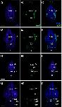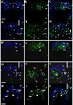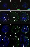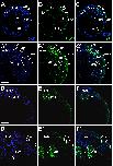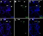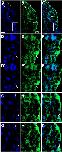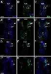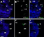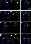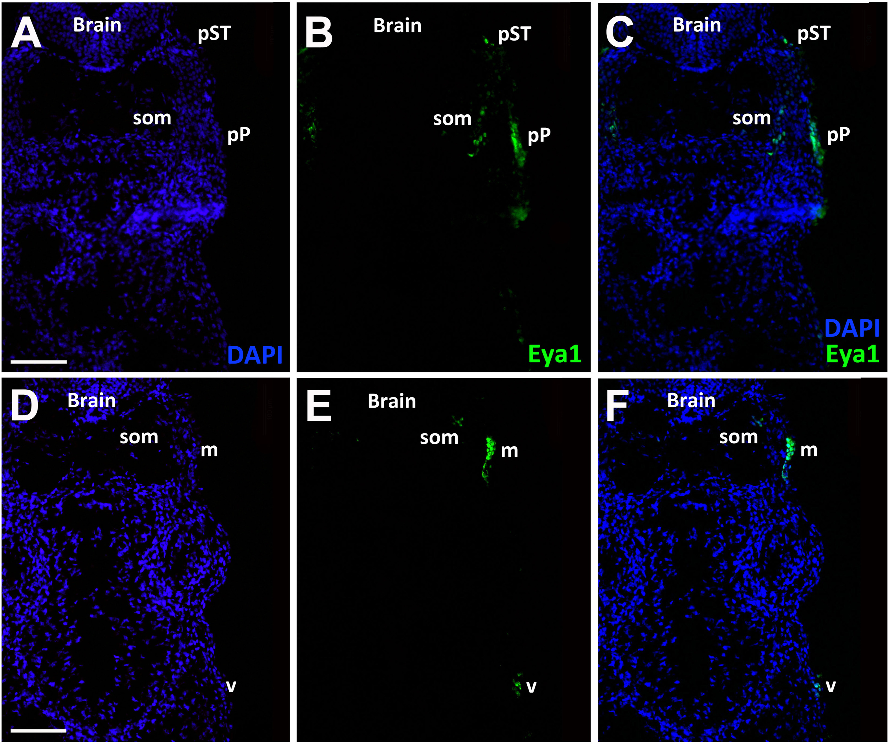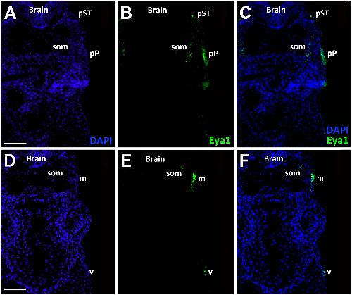 Fig. 14. Eya1 distribution in transverse sections of Xenopus laevis at stage 40 (cont.). A-F: Overview of stage 40 tadpole showing nuclear DAPI staining (first column), Eya1 immunostaining (second column) and merged channels (third column). Eya1 is expressed in posterior lateral line placode (pP), supratemporal lateral line placode (pST), the sensory ridges of middle trunk line (m) and ventral trunk line (v) and in somites (som). Eya1 expression is undetectable in brain. Scale bars: A, D: 100 μm (for A-C and D-F). |