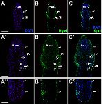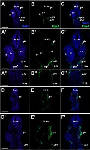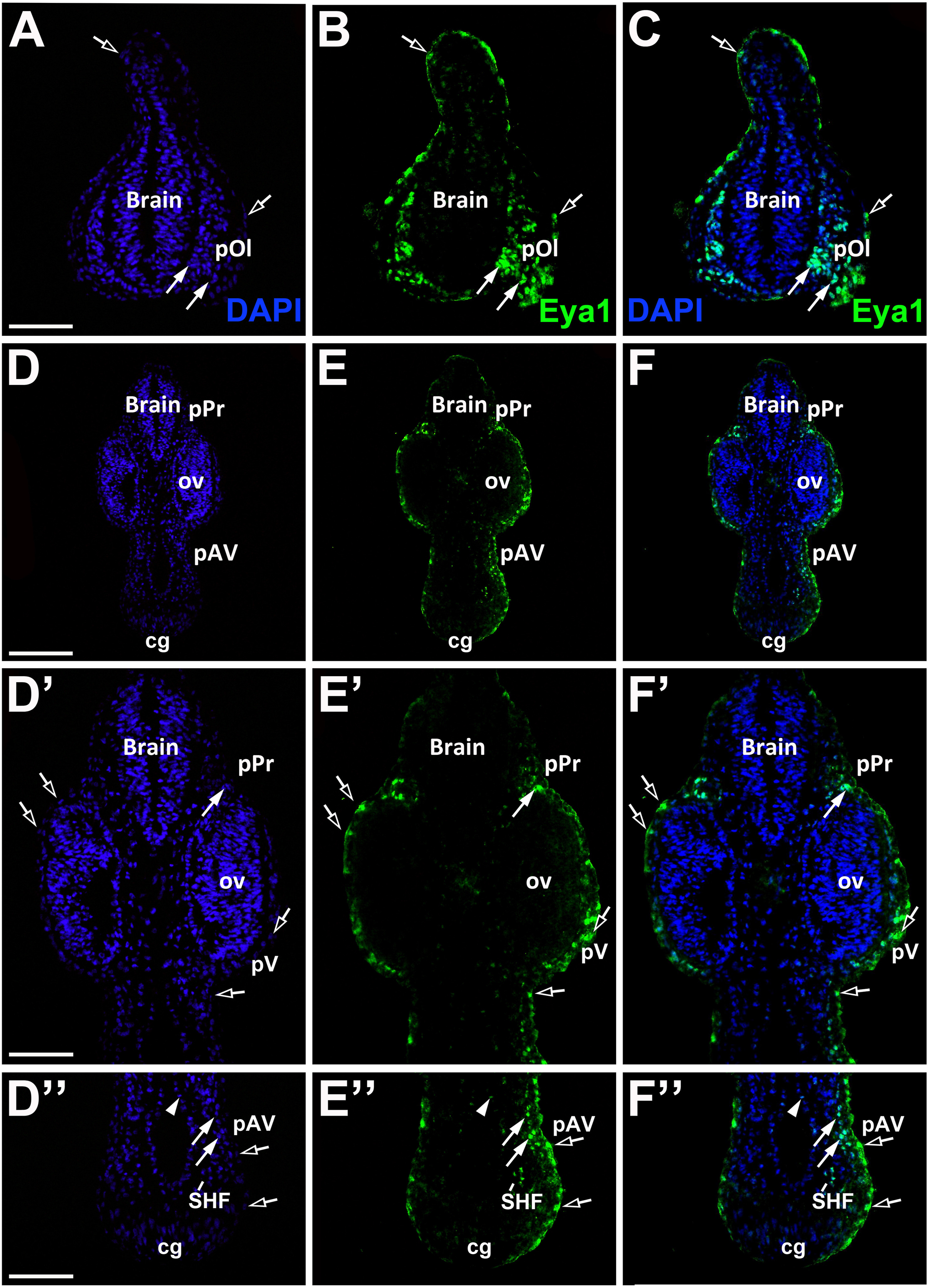 Fig. 6. Eya1 distribution in transverse sections of Xenopus laevis at stage 26. A-F: Overview of stage 26 embryo showing nuclear DAPI staining (first column), Eya1 immunostaining (second column) and merged channels (third column) with higher magnification views shown in Dâ-Fââ.. Eya1 is localized to nuclei in placodes (filled arrows) and endoderm (arrowheads). Eya1 is also expressed in nuclei and apical cytoplasm of scattered cells in the superficial ectodermal layer (open arrows). Eya1 is expressed in olfactory placode (pOl), profundal placode (pPr) and anteroventral lateral line placode (pAV) as well as in some endodermal cells and the mesoderm of the secondary heart field (SHF). Eya1 expression is undetectable in brain, optic vesicle (ov) and cement gland (cg). Scale bars: A: 100 μm (for A-C); D: 200 μm (for D-F); Dâ,ââ: 100 μm (for Dâ-ââ). |