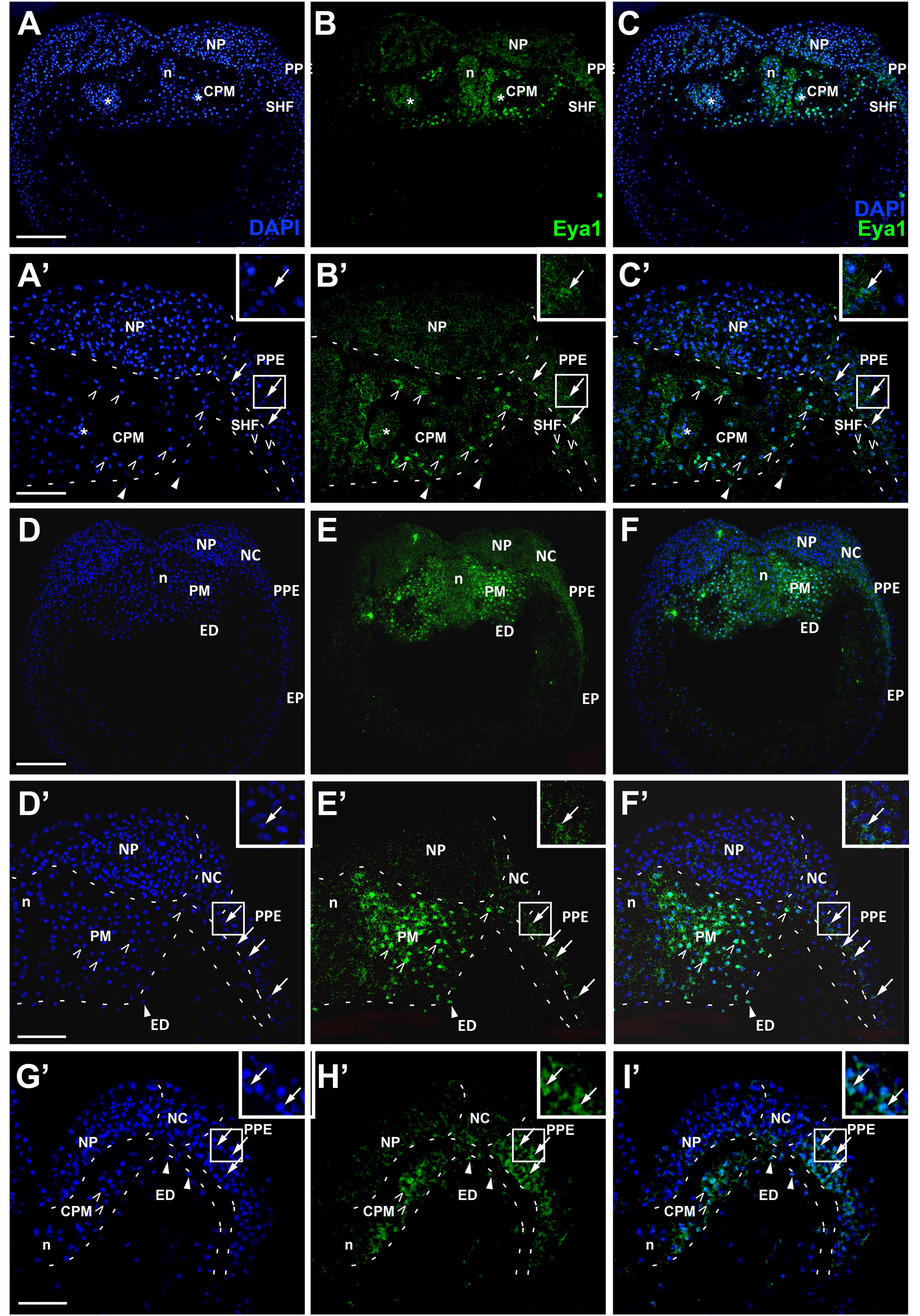 Fig. 3. Eya1 distribution in transverse sections of Xenopus laevis at neural plate and fold stages. A-F: Transverse sections through the anterior (A-C) and posterior (D-F) cranial region of a stage 15 embryo showing nuclear DAPI staining (first column), Eya1 immunostaining (second column) and merged channels (third column) with higher magnification views shown in AâFâ). Boxed areas shown at higher magnification in insets. Gâ-Iâ: High magnification transverse sections through the anterior cranial region of a stage 18 embryo. Eya1 is expressed in cytoplasm and nuclei in preplacodal ectoderm (PPE; nuclear staining indicated with arrows), endoderm (ED; nuclear staining indicated with arrowheads), and parts of the mesoderm (nuclear staining indicated with open arrowheads) including paraxial mesoderm (PM), cranial paraxial mesoderm (CPM) and the adjacent secondary heart field (SHF). Nuclear staining in PPE is still weak at stage 15 but becomes stronger at stage 18. Eya1 expression is undetectable in neural plate (NP), neural crest (NC), notochord (n) and epidermis (EP). Asterisk indicates cells of the anteriormost neural plate which is tangentially sectioned in A-C. Boxed areas shown at higher magnification in insets. Scale bars: A, D: 200 μm (for A-C and D- F); Aâ,â, Gâ: 100 μm (for Aâ-Câ, Dâ-Fâ and Gâ-Iâ). |
