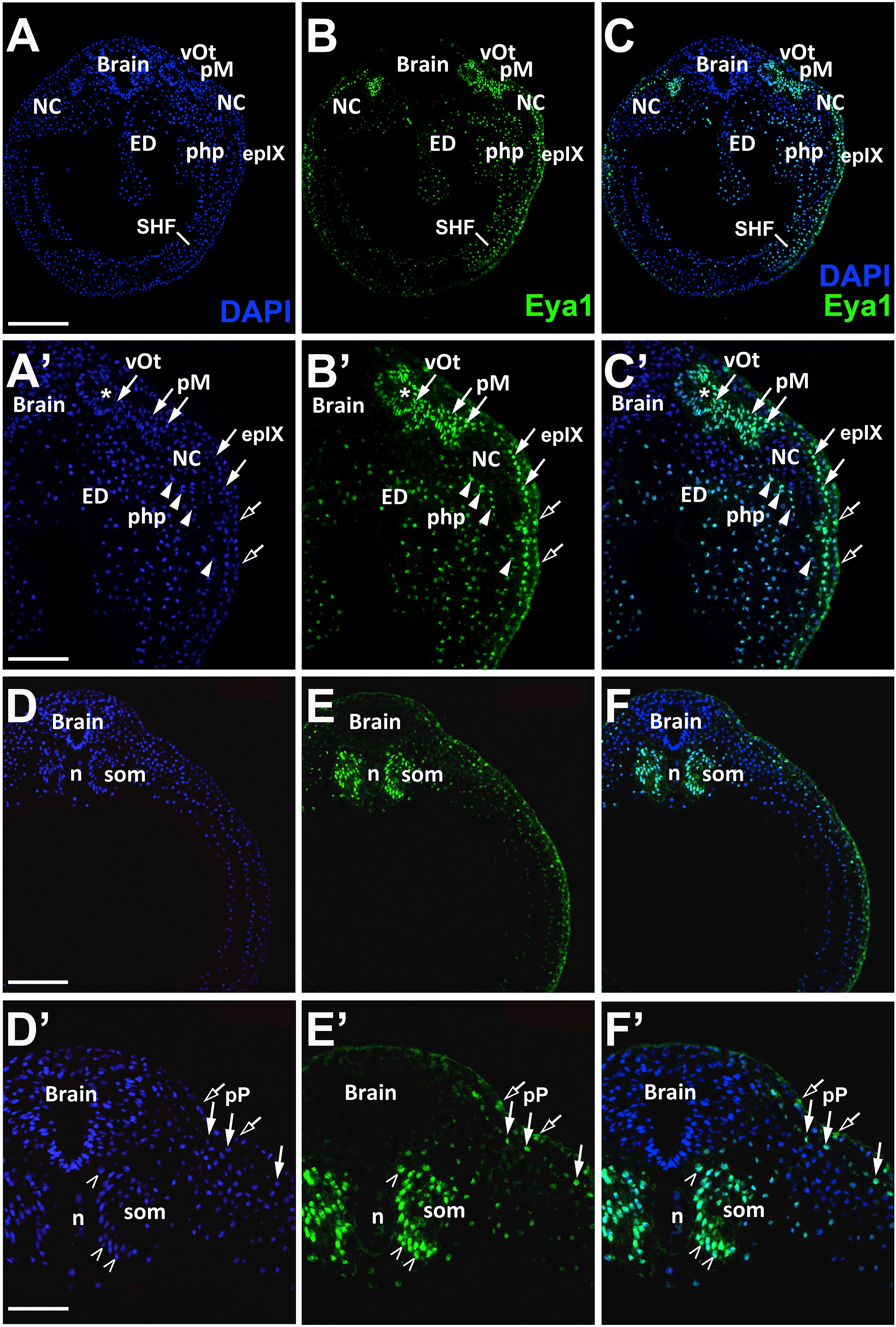 Fig. 5. Eya1 distribution in transverse sections of Xenopus laevis at stage 21 (cont.). A-F: Overview of stage 21 embryo showing nuclear DAPI staining (first column), Eya1 immunostaining (second column) and merged channels (third column) with higher magnification views shown in Aâ-Fâ. Eya1 is localized to nuclei in placodes (filled arrows), endoderm (ED; arrowheads), and somites (som; open arrowheads). Eya1 is also expressed in nuclei and apical cytoplasm of scattered cells in the superficial ectodermal layer (open arrows). Specifically, Eya1 is expressed in the prospective otic vesicle (vOt), middle lateral line placode (pM), posterior lateral line placode (pP) and glossopharyngeal epibranchial placode (epIX) all of which are still part of a common posterior placodal area, as well as in the endoderm (ED) including pharyngeal pouches (php) and the mesoderm of the secondary heart field (SHF). Eya1 expression is undetectable in brain, neural crest (NC), notochord (n) and optic vesicle (ov). Scale bars: A, D: 200 μm (for A-C and D- F); Aâ, Dâ: 100 μm (for Aâ-â and Dâ-â). |