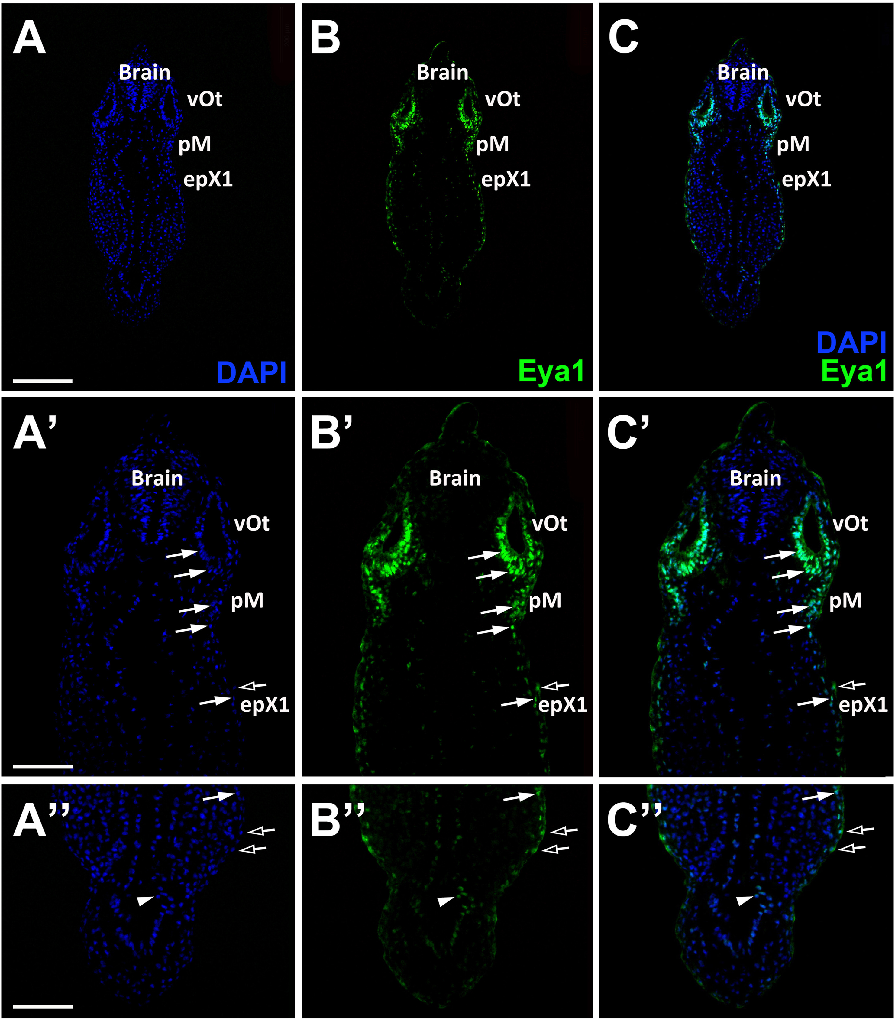 Fig. 9. Eya1 distribution in trasverse sections of Xenopus laevis at stage 26 (cont.). A-C: Overview of stage 26 embryo showing nuclear DAPI staining (first column), Eya1 immunostaining (second column) and merged channels (third column) with higher magnification views shown in Aâ-Câ. Eya1 is localized to nuclei in placodes (filled arrows) and endoderm (arrowheads). Eya1 is also expressed in nuclei and apical cytoplasm of scattered cells in the superficial ectodermal layer (open arrows). Eya1 is expressed in the otic vesicle (vOt), the middle lateral line placode (pM) and the first vagal placode (epX1). Eya1 expression is undetectable in the brain. Scale bars: A: 200 μm (for A-C); Aâ,ââ: 100 μm (for Aâ-â, Aââ-ââ). |