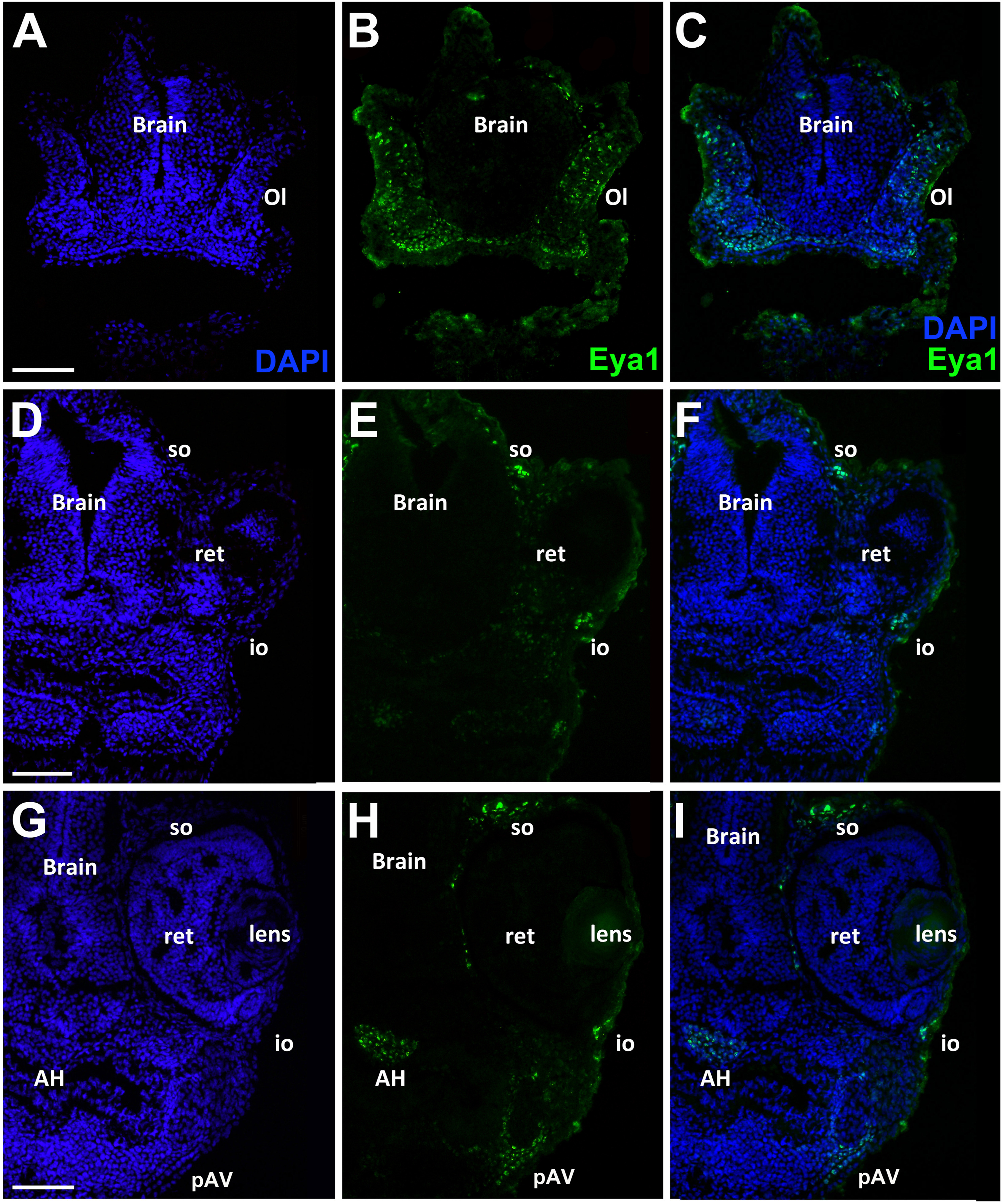 Fig. 11. Eya1 distribution in transverse sections of Xenopus laevis at stage 40. A-I: Overview of stage 40 tadpole showing nuclear DAPI staining (first column), Eya1 immunostaining (second column) and merged channels (third column). Eya1 is expressed in olfactory epithelium (Ol), adenohypophysis (AH), anteroventral lateral line placode (pAV), sensory ridges of supraorbital lateral line (so) and of infraorbital lateral line (io). Eya1 expression is undetectable in brain, lens and retina (ret). Scale bars: A, D, G: 100 μm (for A-C, D-F and G-I). |