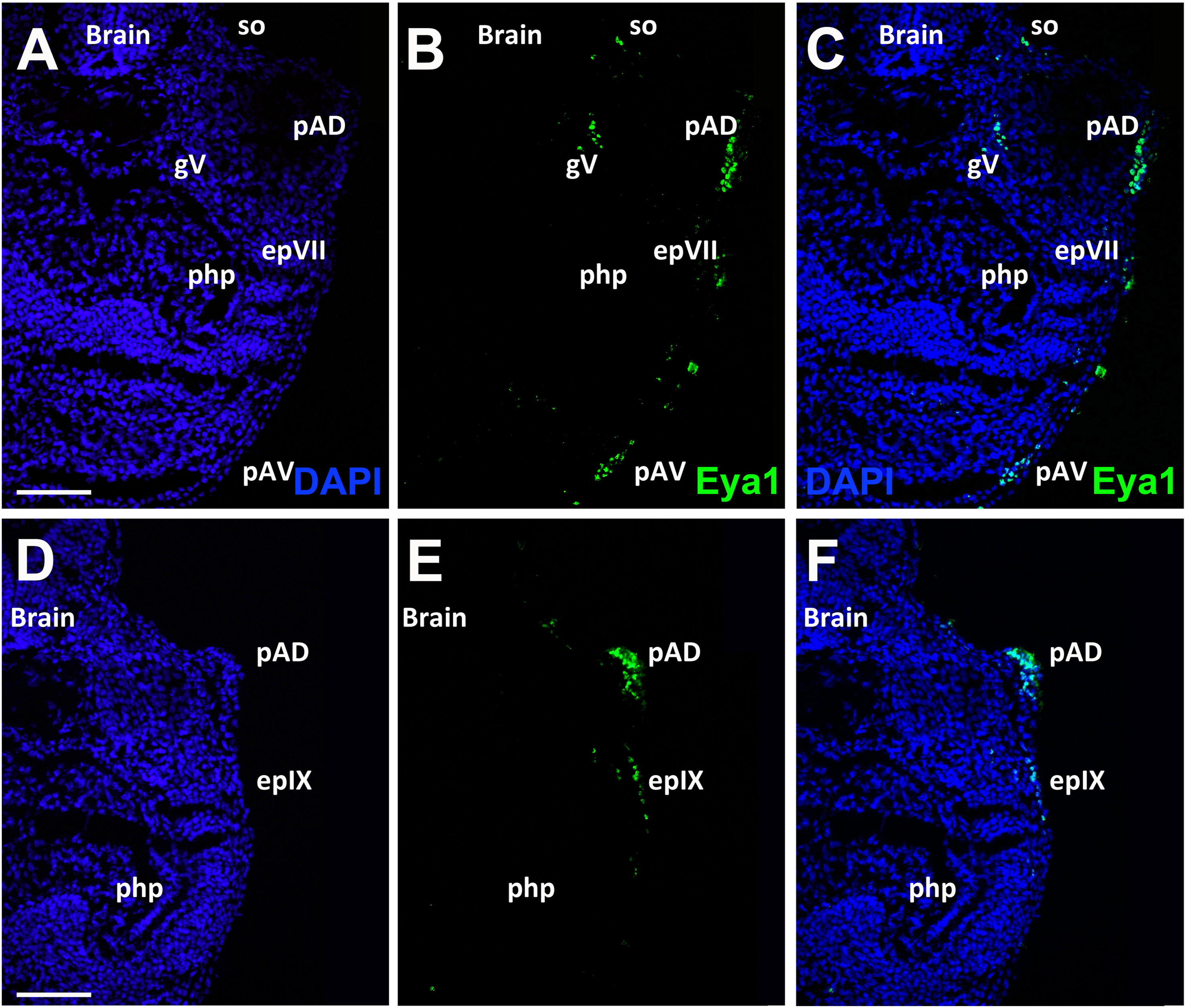 Fig. 12. Eya1 distribution in transverse sections of Xenopus laevis at stage 40 (cont.). A-F: Overview of stage 40 tadpole showing nuclear DAPI staining (first column), Eya1 immunostaining (second column) and merged channels (third column). Eya1 is expressed in trigeminal ganglion (gV), anterodorsal lateral line placode (pAD), anteroventral lateral line placode (pAV), sensory ridge of supraorbital lateral line (so), the facial epibranchial placode (epVII) and glossopharyngeal epibranchial placode (epIX). Eya1 expression is undetectable in brain and pharyngeal pouches (php). Scale bars: A, D: 100 μm (for A-C and D-F). |