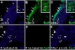 Fig. 4. Eya1 distribution in transverse sections of Xenopus laevis at stage 21. Overview of stage 21 embryo showing nuclear DAPI staining (first column), Eya1 immunostaining (second column) and merged channels (third column) with higher magnification views shown in Aâ-Fâ. Eya1 . localizes to nuclei in placodes (arrows) and placode derived ganglia (double arrows). Eya is localized to nuclei in placodes (filled arrows) including olfactory placode (pOl), profundal placode (pPr) and ganglion (gPr), trigeminal placode (pV) and adenohypophyseal placode (pAH). Eya1 is also expressed in nuclei and apical cytoplasm of scattered cells in the superficial ectodermal layer (open arrows). Eya1 expression is undetectable in brain and optic vesicle (ov). Scale bars: A, D: 200 μm (for A-C and D- F); Aâ, Dâ: 100 μm (for Aâ-â, and Dâ-â) |