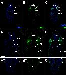 Fig. 1. Specificity of Eya1 antibodies. AâF: Peptide competition assay for anti-Eya1 GP1 antibody. Transverse sections through the left otic vesicle of a Xenopus embryos at stage 20 analyzed in single confocal planes (dorsal to the top, medial to the right). Different channels of same section shown in A-C and D-F. Insets in A-C show expression of Eya1 in nuclei and cytoplasm in somites in another section. Arrows indicate nuclear expression in placodes, open arrows indicate nuclear expression in the surface layer of the ectoderm, arrowheads indicate nuclear expression in pharyngeal endoderm, open arrowheads indicate nuclear expression in somites. Asterisk indicates a sectioning artefact (tear). All domains of Eya1 immunostaining as evident in control embryos (A-C) are blocked after addition of Eya1 peptide (5 μg peptide/1 μg Eya1 antibody; D-F). Not: notochord; som: somite. Scale bar in A: 50 μm (for all panels). |