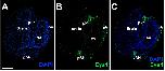Fig. Suppl. 1. Eya1 distribution in transverse sections through anterior head of Xenopus laevis at stage 23. Nuclear DAPI staining (A), Eya1 immunostaining (B) and merged channel (C) is shown. Eya1 is localized to nuclei in the profundal placode (pPr), trigeminal placode (pP) and adenohypophyseal placode (pAH) Eya1 expression is undetectable in the brain and optic vesicle (ov). Scale bar in A:100 μm (for A-C). |