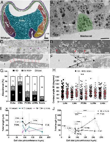 Fig. 1. Cell–cell contacts in the X. laevis gastrula. (A) Midsagittal semithin section of stage 11 Xenopus gastrula outlining dorsal tissues: Ectoderm (Ecto; green), chordamesoderm (CMe; yellow), prechordal mesoderm (PCMe; orange), leading-edge mesendoderm (LEMe; red), and endoderm (Endo; blue). Arrows: D, dorsal; V, vegetal. Epithelial layer, bottle cells (purple), and ventral mesoderm (VeMe; magenta) were not analyzed. (B–F) TEM images. (B) Ectoderm with cell highlighted in green. (C) Pair contact between interstitial gaps (i) with narrow (yellow arrowheads) and wide regions (purple arrowheads). (D) Narrow <50-nm contact with sections filled with dense material (white arrowheads) and membrane pits and membrane-adjacent elongate vesicles (red arrowheads). (E) Wide contact, width determined by measuring intercellular distance in 100-nm intervals (red dotted lines). (F) Contact angle 2θ between cells at the ends of contact (i). (G) Mean relative abundance of narrow (<50 nm) and wide (>50 nm) contacts and gaps. (H) Contact angles between cells as in F. (I and J) Total length of adhesive contacts and gaps as a function of cell circumference. Error bars represent SD of the mean. For P values refer to SI Appendix, Tables S2 and S3. n = 24 embryos for all tissues. P > 0.05 n.s., P < 0.05*, P < 0.01**, P < 0.001***, P < 0.0001****. (Scale bars: black, 100 μm in A; 10 μm in B; and white, 1 μm.) |