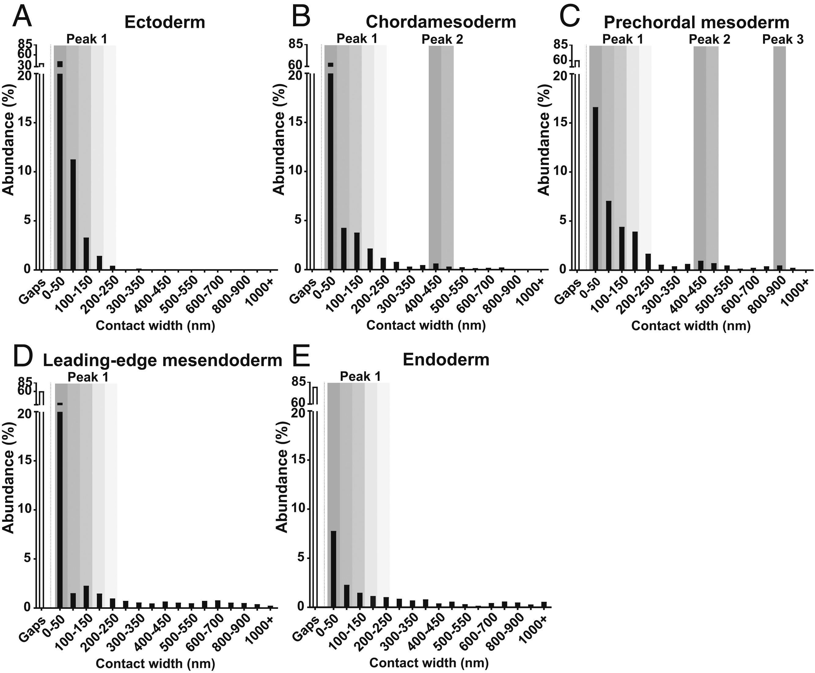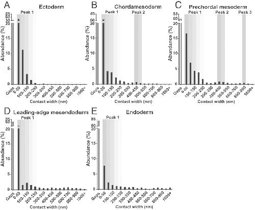 Fig. 2. Tissue-specific contact spectra in the X. laevis gastrula. Contact widths were binned at 50-nm intervals, and their respective abundance was determined for (A) ectoderm, (B) chordamesoderm, (C) prechordal mesoderm, (D) leading-edge mesendoderm, and (E) endoderm. Recurrent peaks are highlighted by shaded regions. n = 24 embryos for all tissues. |