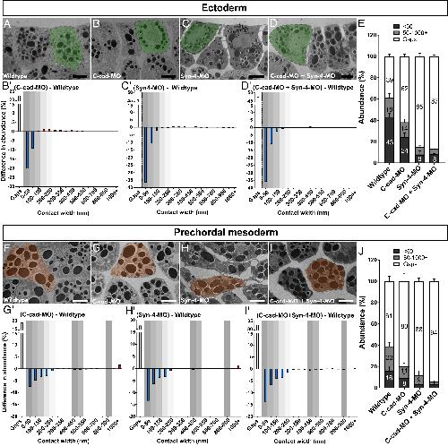 Fig. 4. Knockdown of C-cadherin and Syndecan-4. (A–D and F–I) TEM images of wild-type, C-cad, and Syn-4 morphant ectoderm and prechordal mesoderm. Single cells are highlighted in green or orange. (B′–D′ and G′–I′) Difference spectra for ectoderm and prechordal mesoderm. The Left-most, white column in each graph denotes interstitial gaps. Colored columns indicate changes in abundance, which are statistically significant (P < 0.05) and represent ≥50% changes in morphants compared with wild type (blue, decrease; red, increase). Gray shades highlight positions of recurrent peaks. (E and J) Abundance of narrow and wide contacts and of gaps. Error bars represent SD of the mean. For P values refer to Datasets S2 and S3. (Scale bars: black, 10 μm; white, 15 μm.) Wild type: n = 24 embryos; C-cad-MO: n = 14; Syn-4-MO: n = 10; and C-cad-MO+Syn-4-MO: n = 8. |
