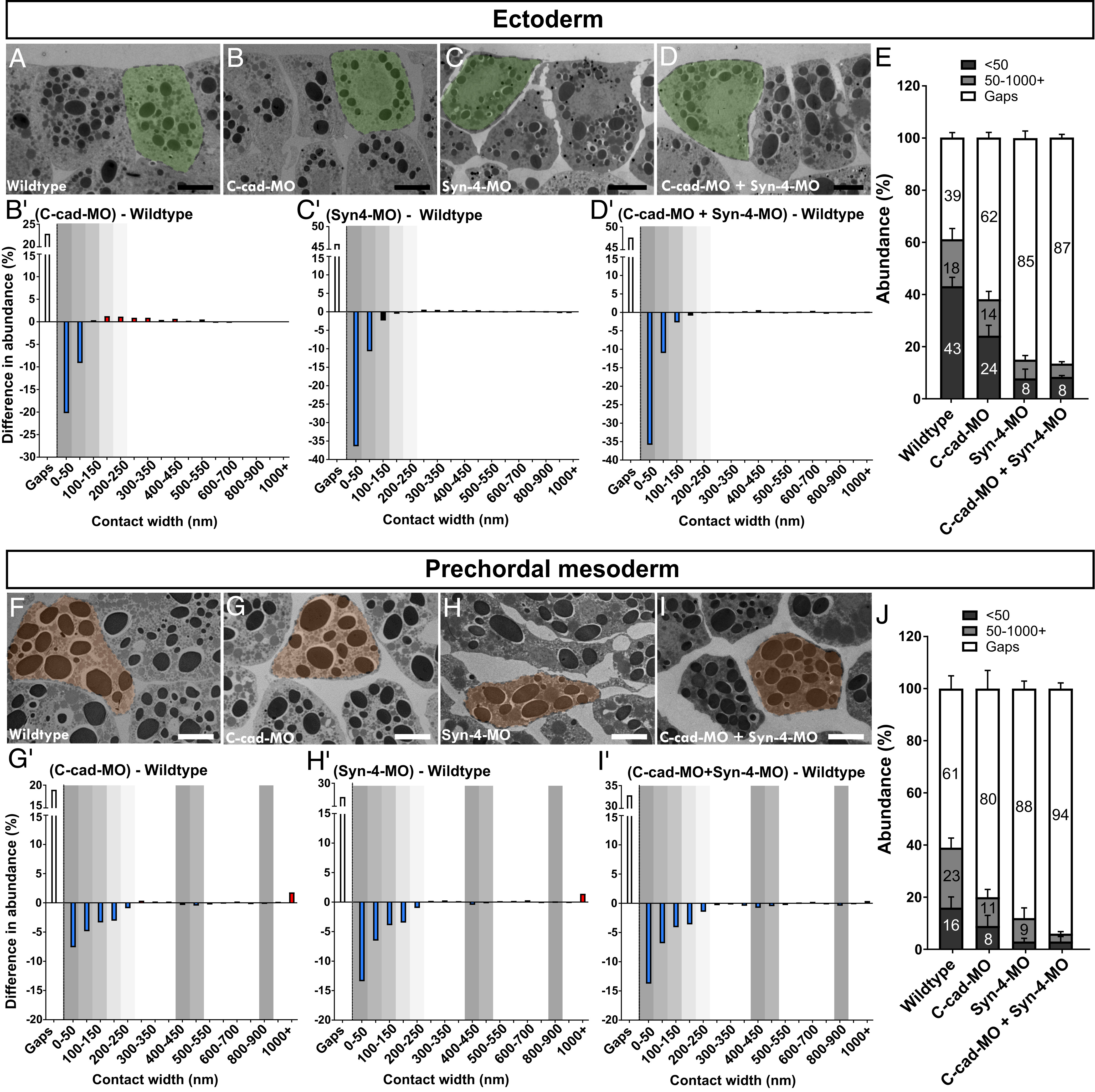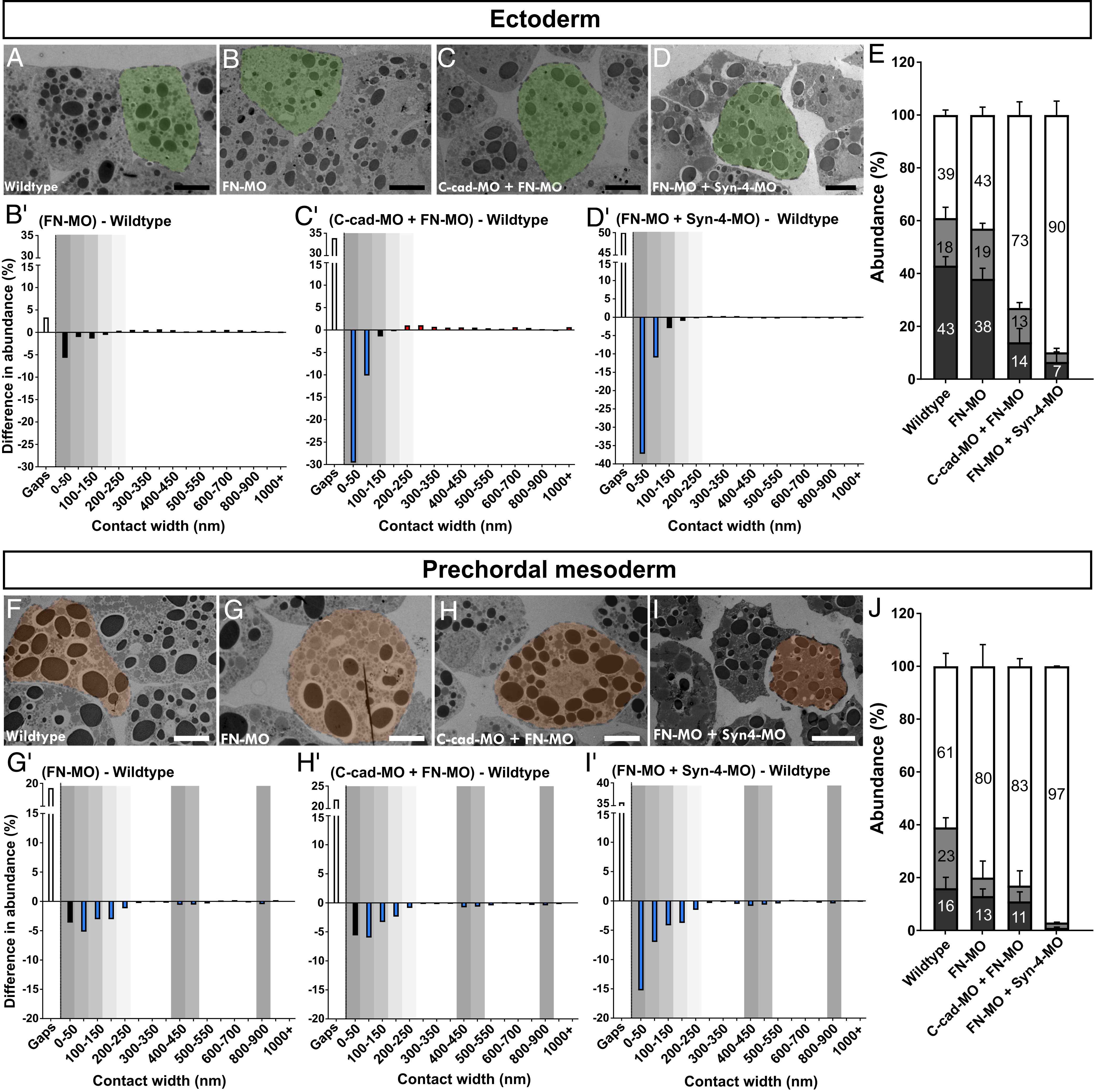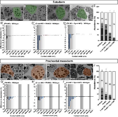 Fig. 5. Knockdown of FN. (A–D and F–I) TEM images of wild-type and FN, C-cad/FN, and FN/Syn-4 morphant ectoderm and prechordal mesoderm, with single cells highlighted. (B′–D′ and G′–I′) Difference spectra for ectoderm and prechordal mesoderm. Colored columns show changes in abundance as in Fig. 4. Positions of recurrent peaks are shaded in gray. (E and J) Summary of the abundance of narrow and wide contacts and of gaps. Error bars represent SD of the mean. For P values refer to Datasets S2 and S3. (Scale bars: black, 10 μm; white, 15 μm.) Wild type: n = 24 embryos; FN-MO: n = 12; C-cad-MO+FN-MO: n = 15; and FN-MO+Syn-4-MO: n = 9. |
