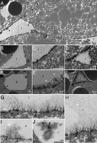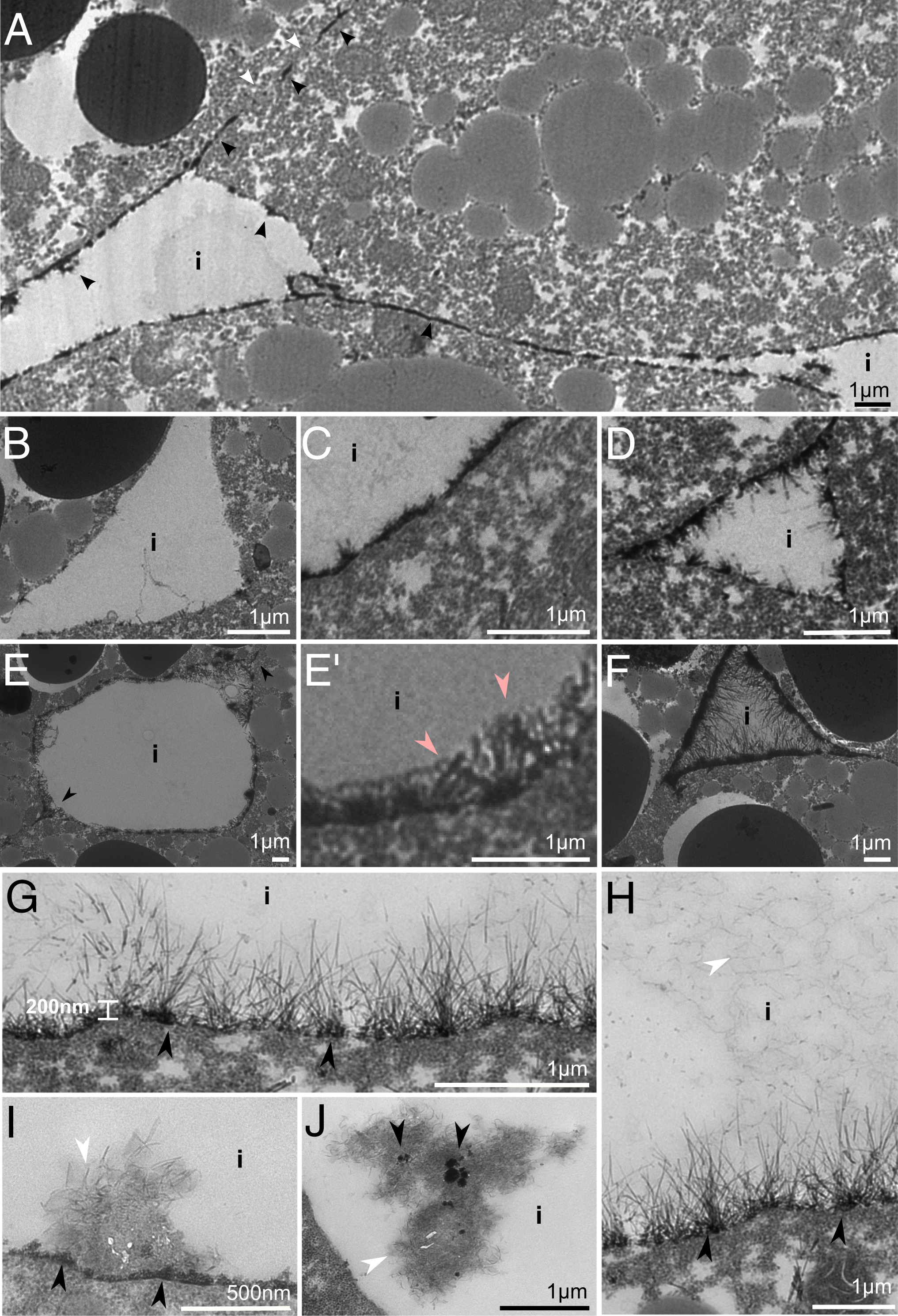 Fig. 7. La3+ staining of interstitial gaps. (A) Low magnification view of La3+-stained stretches in contacts and interstitium. Interstitial gap (i) surfaces (B) displaying little to no lanthanum staining, (C) contiguous, dense plaques; (D–E′) a bush-like glycocalyx; or (F–G) a fine fibrillar glycocalyx based on dense plaques or a zone of dense lumps (black arrowheads). (E and E′) A bush-like glycocalyx is embedded in a faintly stained material (pink arrowheads). (H) Gaps are often filled with fine, wavy fibrils (white arrowhead). (I) Aggregates of straight and wavy fibrils attached to dense plaques on the cell surface or (J) unattached in the interstitium, together with dense lumps. |