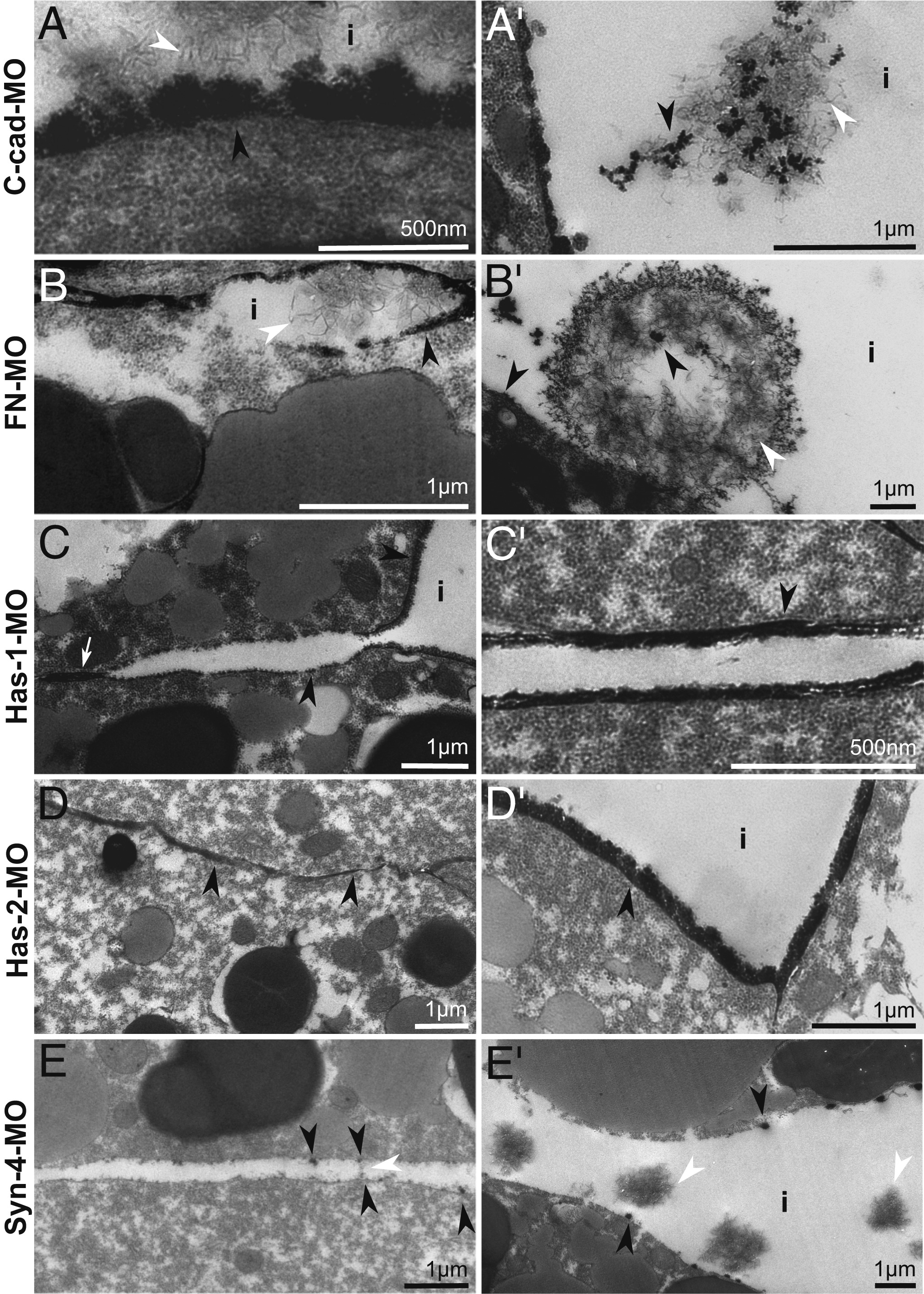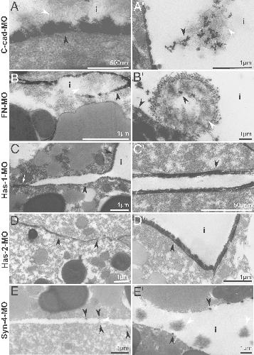 Fig. 9. Modulation of glycocalyx structure by adhesion factors. TEM images of La3+-stained structures in morphants. (A and A′) C-cad and (B and B′) FN morphant prechordal mesoderm with plaques (black arrowheads), thin fibrils (white arrowheads), and (A′ and B′) fibril aggregates containing dense lumps in interstitium (i). (C and C′) Has-1 morphant prechordal mesoderm with plaque layer in 120-nm contact (white arrow) and in gap (i), and (C′) with 40-nm plaque layers on either side of 200-nm wide contact. (D) Has-2 morphant ectoderm, glycocalyx-filled contact from 15 to 130 nm wide. (D′) Gap with plaque layer in Has-1-MO mesoderm. (E and E′) Syn-4 morphant mesoderm. (E) A 200- to 400-nm contact with small, sparse lumps (black arrowheads) and a fibril (white arrowheads). (E′) Fibril aggregates without lumps. |