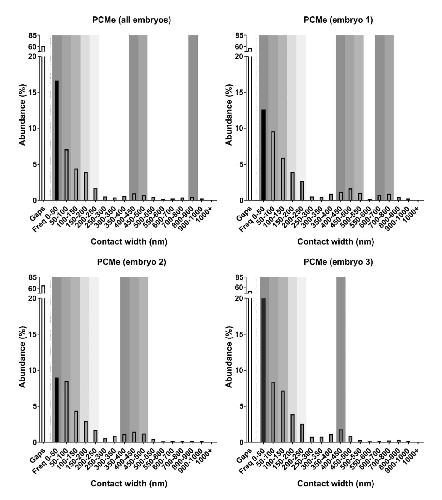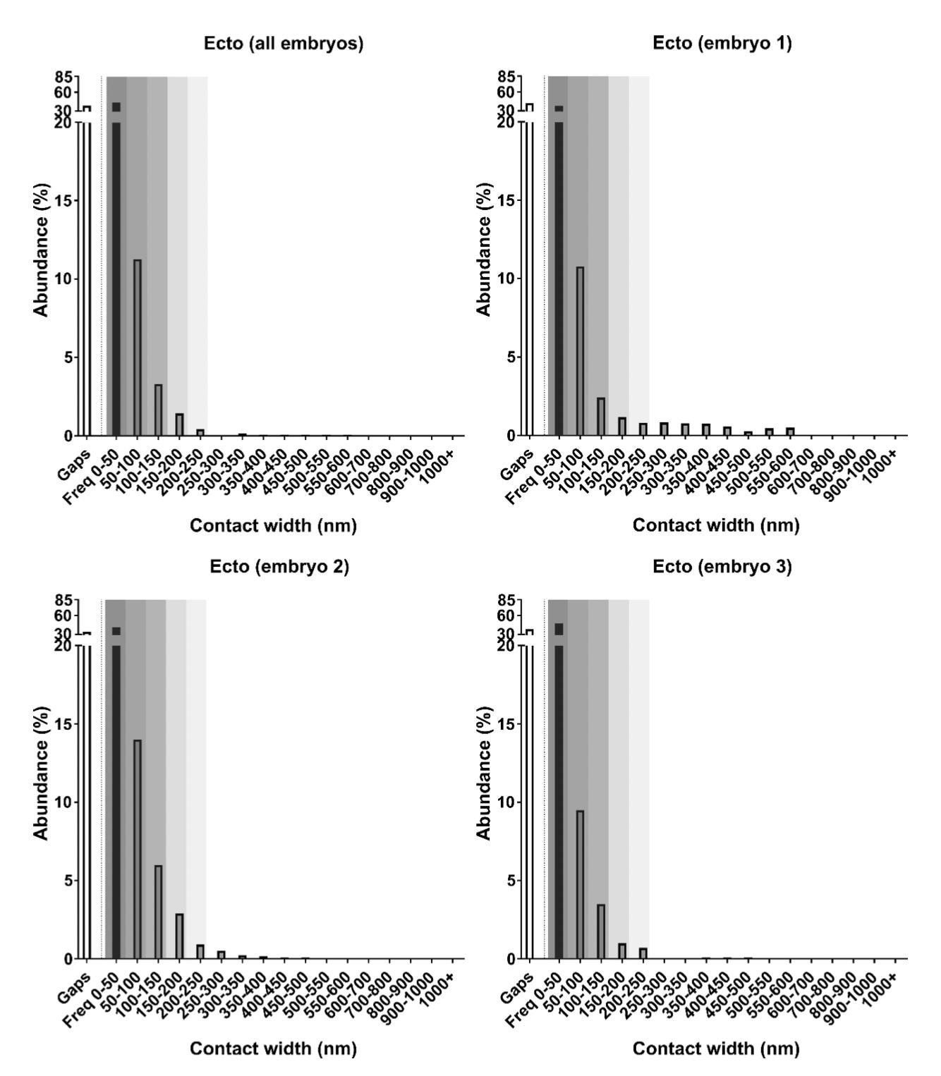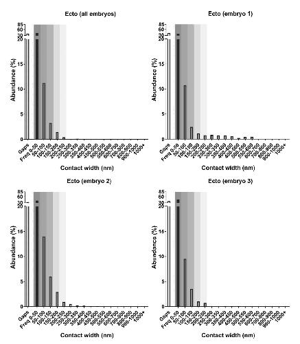 Supplementary figure 3. Reproducibility of ectoderm contact spectrum. Wildtype ectoderm contact spectra from 3 individual embryos as compared to summary spectrum from all 24 embryos. Contacts in the 250-600 nm width range (embryo 1) occur in exceptional cases and disappear in the background when contacts are summed over all 24 embryos. Peak 1 is highlighted by shaded region. |